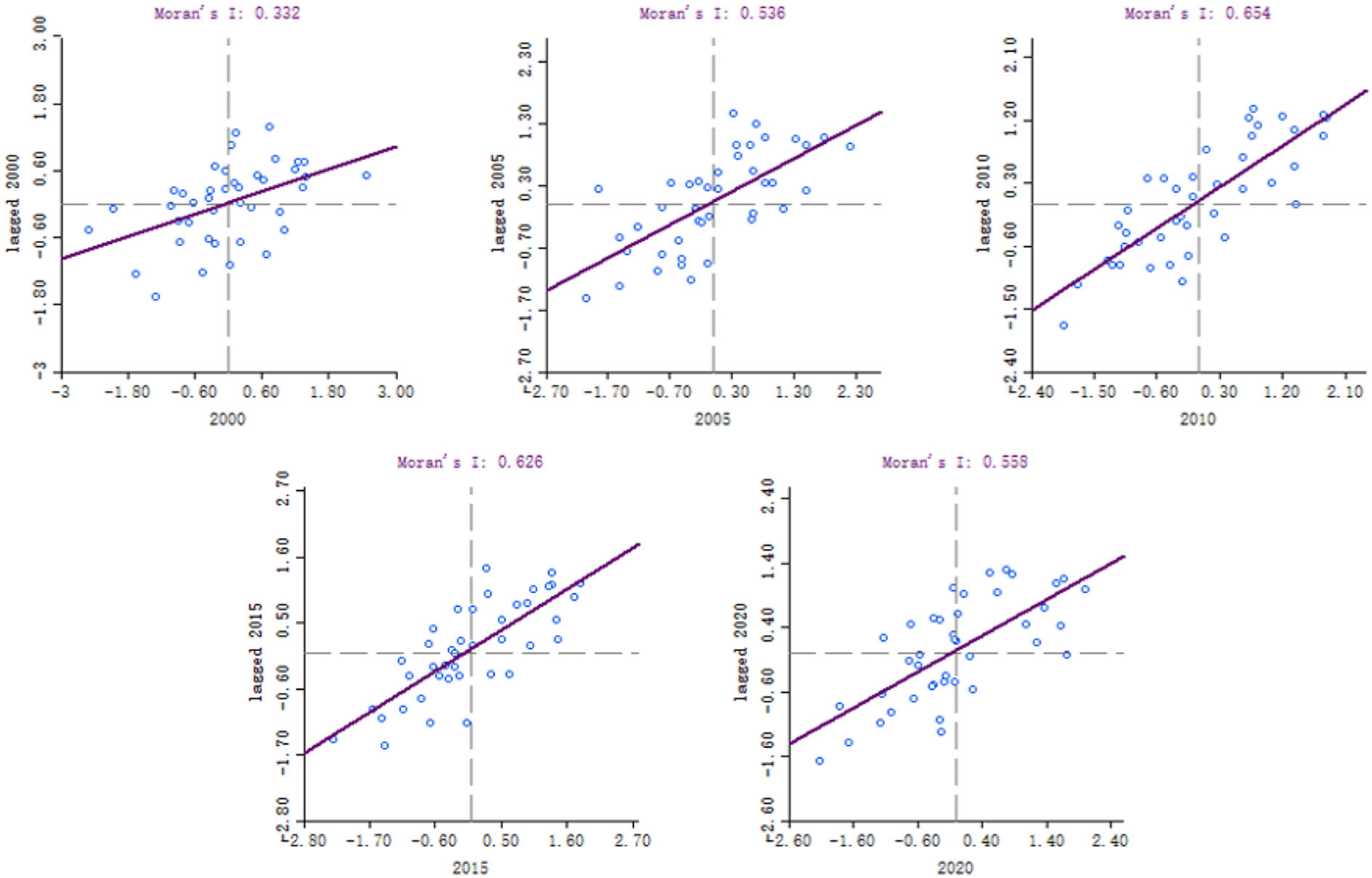 Moran's I scatter points in 41 cities of the Yangtze River Delta.