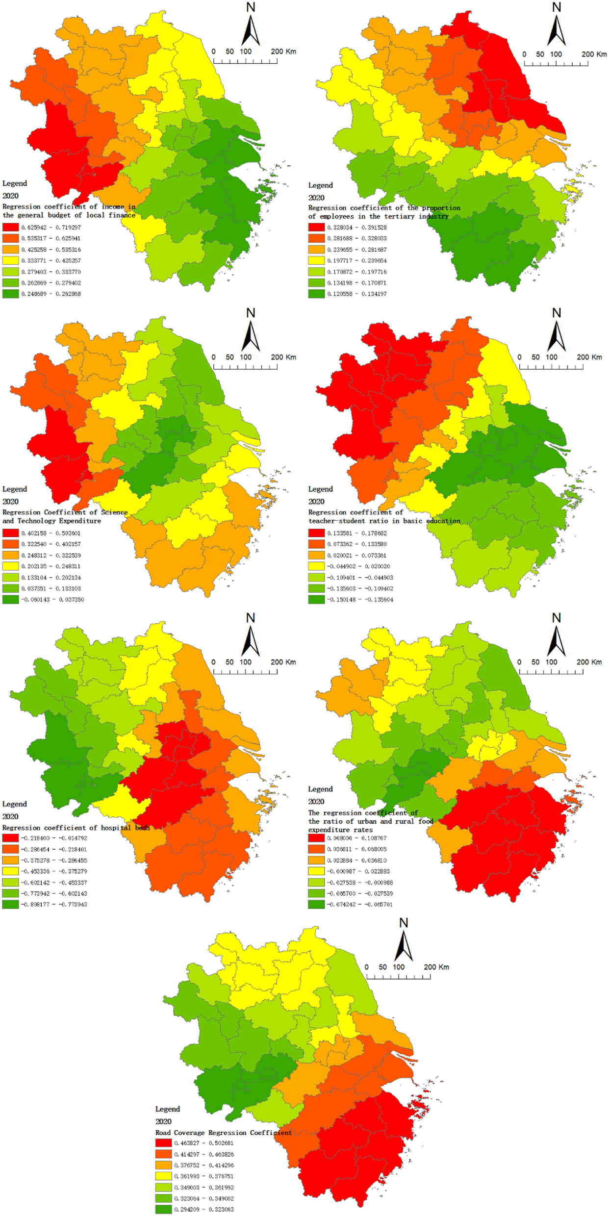 The geographically weighted regression (GWR) model can be applied to reflect the local characteristics of the relationship between variables and visualizes the different effects of the same index on the regression results in different spaces. This paper aims to explore the specific changes in the size and direction of regression parameters of influencing factors of urban-rural integration development as geographical location changes (Brunsdon et al., 1996).