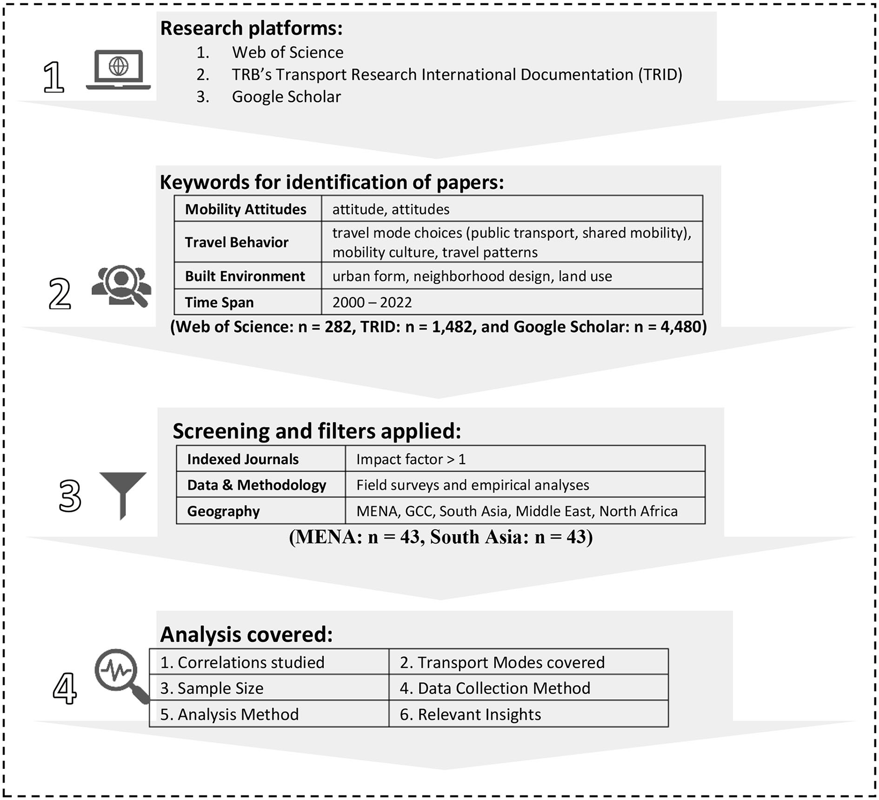 The paper is organized in the following five sections. The subsequent section elaborates the systematic literature search and analysis method. This is followed by the results section illustrating interrelations of travel attitudes, mode choices and socio-spatial issues in the MENA and SA regions. The penultimate section provides a discussion of descriptive perspectives on contextual differences between MENA and SA cities on the one hand and Western cities on the other, and a presentation of knowledge gaps. The final section offers a conclusion and highlights the scope for future research.