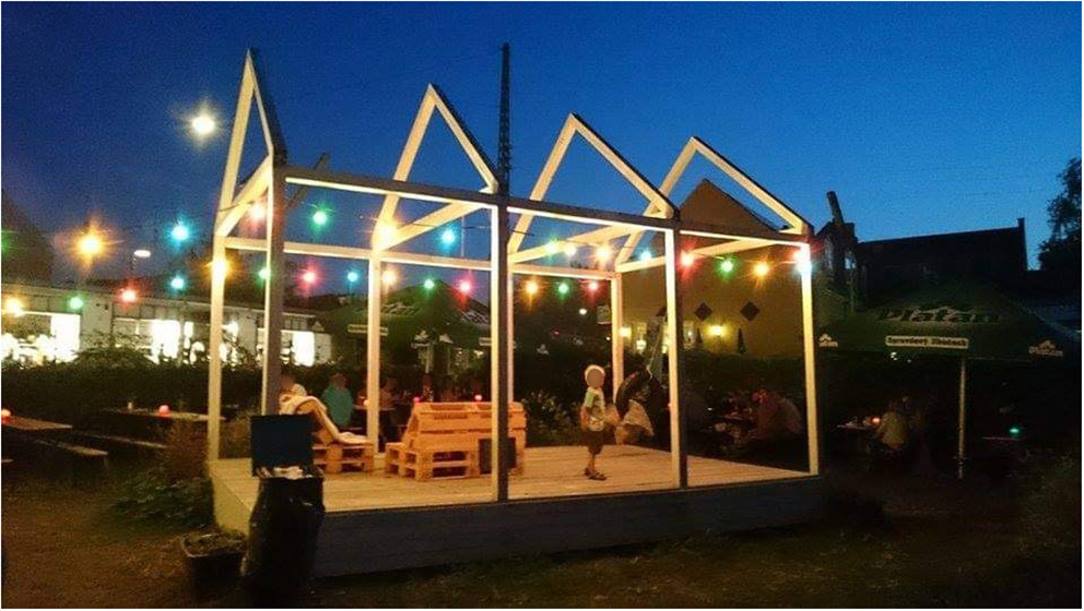 “Valby Pavillon - TH Bar”, a temporary urban project in Copenhagen, Denmark. A vacant urban site (a former auto repair shop) was activated for communal uses through a temporary pavilion, a pop-up container bar, a herb garden and an exchange station. The place existed as a popular destination in the neighborhood until housing construction activities took over the site. TH Bar and its activities are in the process of relocating to a new site in the neighborhood. Credit: Pavilion and project initiation: Bettina Lamm, Anne Wagner and Kristian Skaarup in collaboration with Valby Lokaludvalg (Valby local government committee). TH Bar developed by Nima Alijani. Photo: Bettina Lamm.
