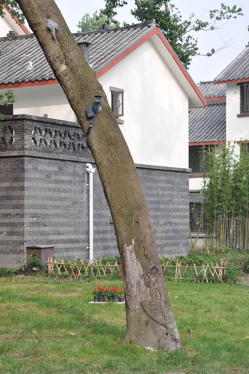 Surveillance camera installed on tree in newly redeveloped village in rural Chengdu. Photograph by author, July 2013.