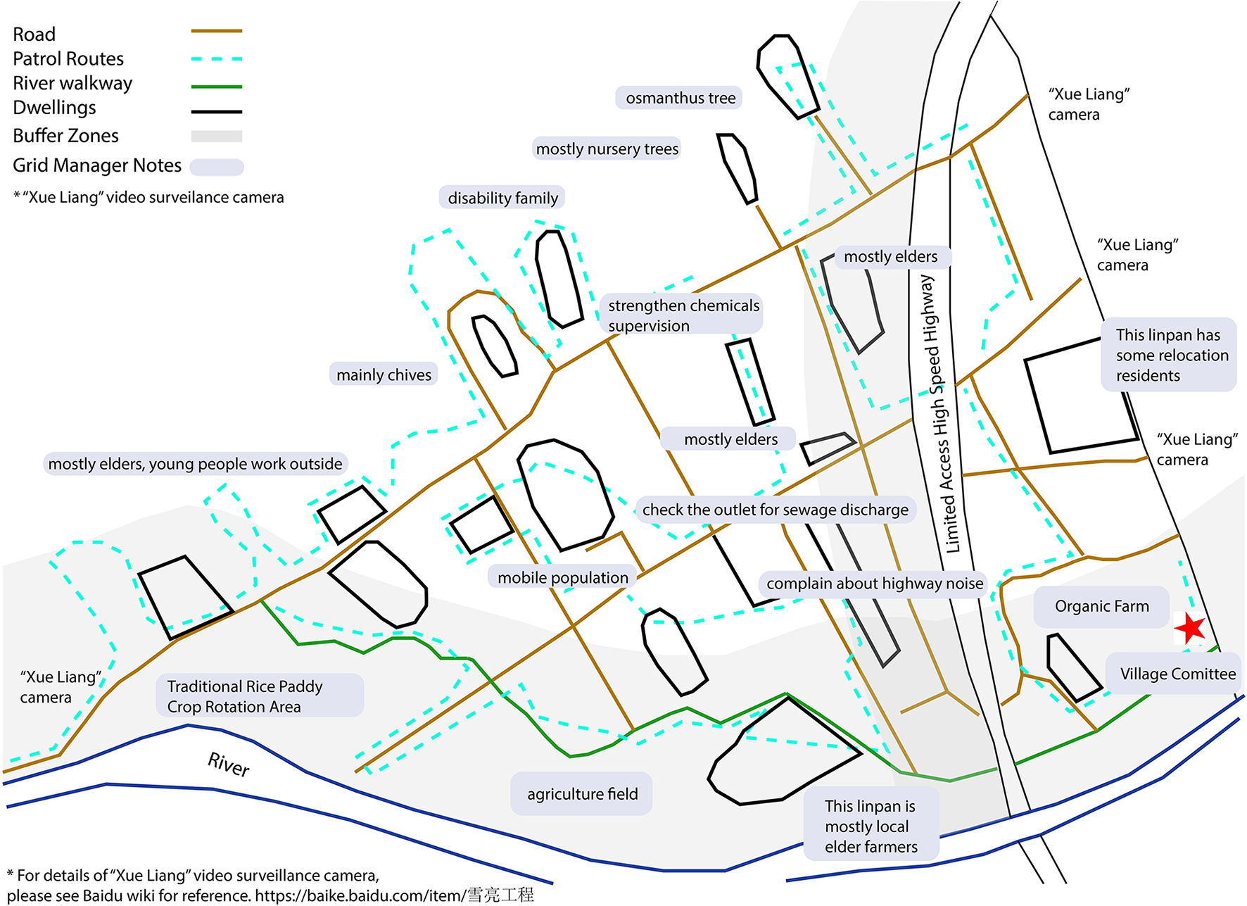 During the field survey to W Village in July 2018, we received permission from a grid manager (Mr. Wei, not his actual name) to observe his regular patrol in the assigned grid. Wei was born in W Village but had left to pursue higher education. This job was a rare opportunity for a local villager to return to his home village and use skills learned at university for village-based work. Wei usually patrolled twice a day in his village. He showed us his own hand drawn patrolling map (Figure 4) to see the main routes and points for which he was responsible. The map included notes he made of the community that did not always fit the rigid categories of data requested by the GMS app. Everyday Wei started his journey from the village committee (the red star in the map), occasionally accompanying a village leader. Driving his electrical van, he first visited the Z Organic Farm, an e-commerce company established in 2018. According to his notes, one priority of his job was visiting some low-income families and elder villagers whose children migrated or worked in cities. Those older farmers don't have physical ability to do agriculture anymore and may encounter many health-related inconveniences especially when their children are not with them. As for environmental monitoring, he used the officially designed smartphone app to report what he found, such as garbage dumping in canals and unapproved use of chemical pesticides in fields, which he geo-located in the app with GPS. He also recorded local complaints about such nuisances as noise from the newly constructed highway. He had some discretion to evaluate whether to report these issues to higher levels of the GMS. Some simple issues such as “necessity to clean the trash in the river” can be solved onsite; other events such as waste/pollution from a factory (not in this village) may need to be reported to and tackle by higher level administrators.