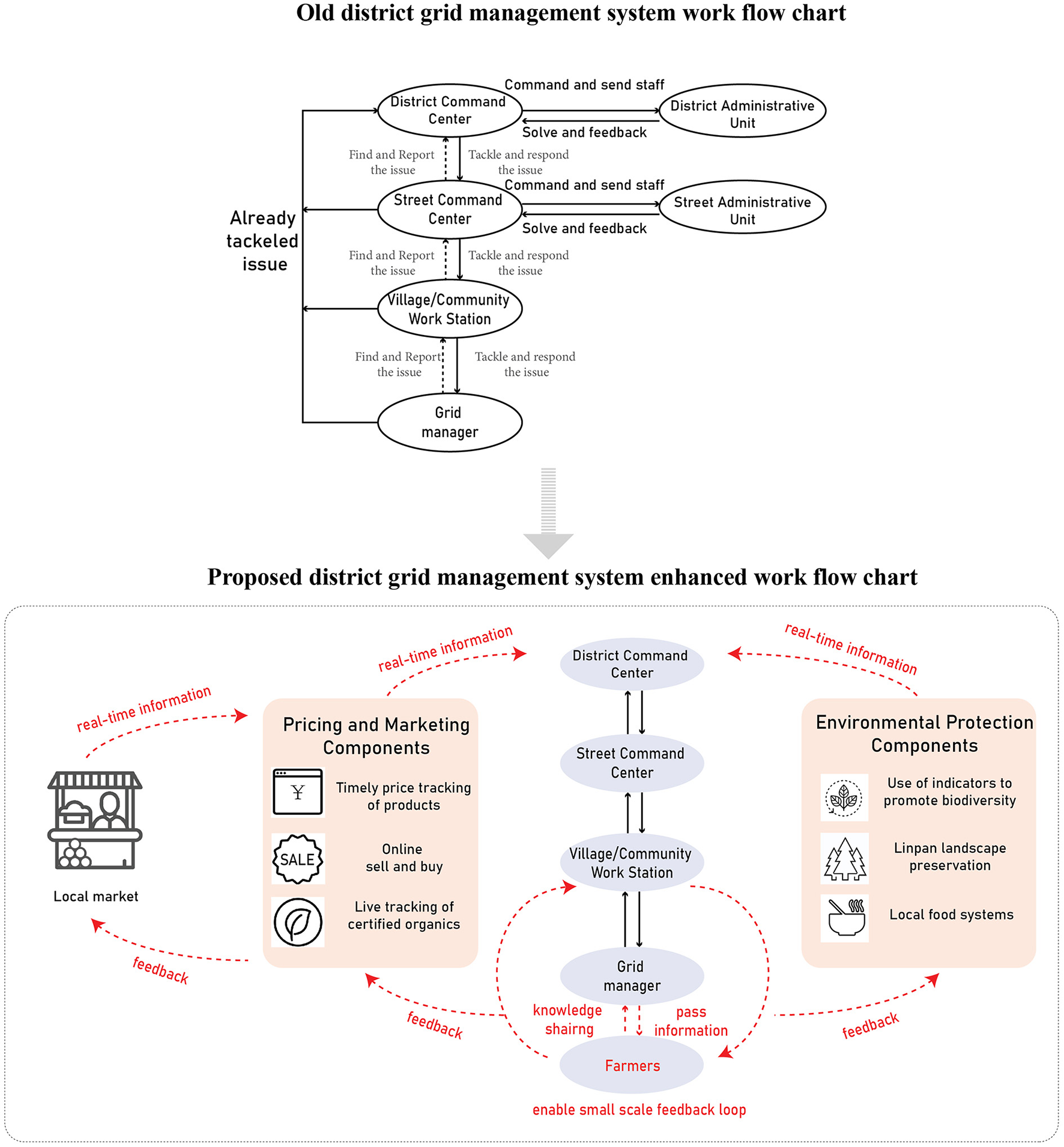 The proposed enhanced feedback loop. The proposed feedback loop could enable the big data gathered from the web to be passed through this net down to the lowest level. Grid managers, in this case, function as an important linkage between the ICT system and the vulnerable groups (e.g., elder farmers). They could deliver the message through personal interaction with local farmers. The old workflow chart is referenced from “Grid Manager Working Manual”, a hard copy provided by Mr. A.