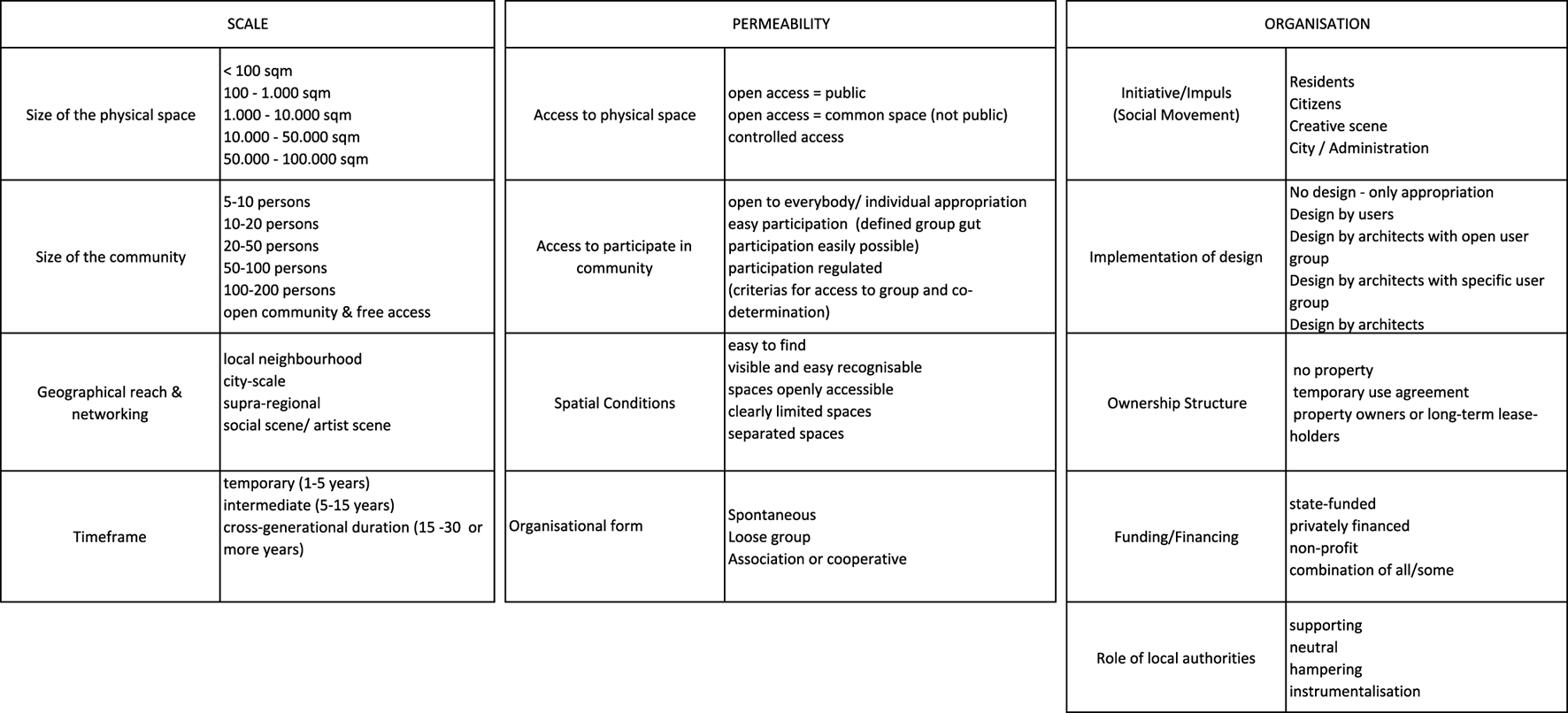 After evaluating and discussing the individual case studies,3 a systematic matrix was developed in a deductive, iterative process. Because spatial and social aspects correlate with each other and can only be explained in combination, the matrix contains spatial, numerical, organizational, and social criteria according to which the case studies are categorized. By analyzing how these variables correlate, we identified three overarching analysis categories within the researched projects: scale, permeability, and organization (Figure 1).