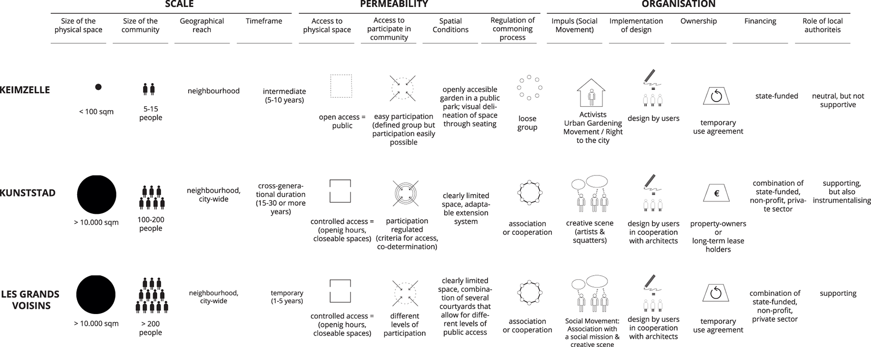 We regard the matrix (Figure 2) as a tool that allows us both to show the complexity in which the factors constituting commons interact and to compare different projects with one another. At the same time, it provides a basis to explore how the combination of specific variables can lead to sustainable urban commons governance and how this influences their impact on urban development.