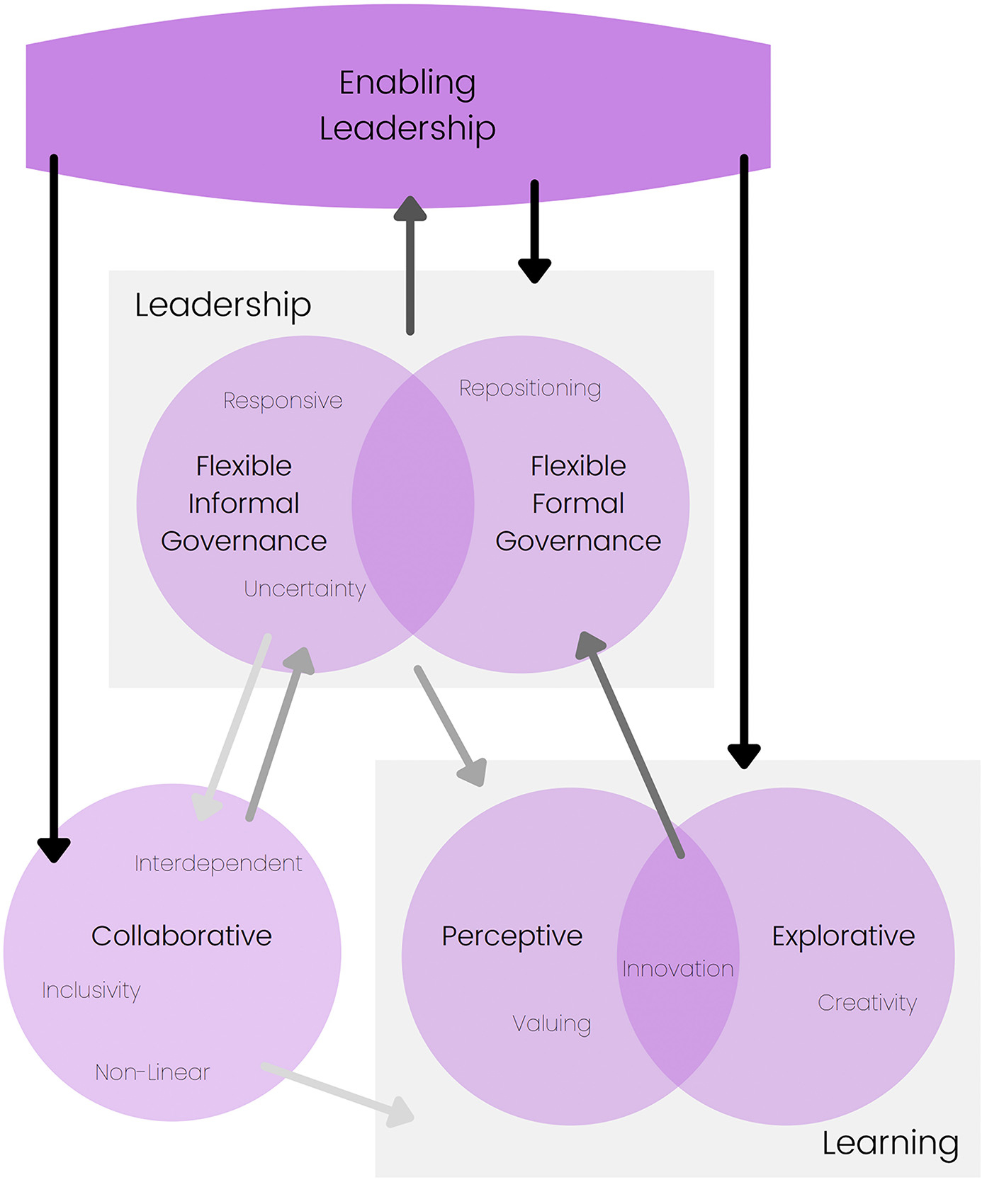 Learning is “both a product of knowledge and [the knowledge] source,” where knowledge is not only shared but created and stored (Daviter, 2017; Serrat, 2017), and the ability to learn establishes a pathway for organizational change. Organizations learn from their experiences and those of their community; and they must store this information as to inform future decision-making (Serrat, 2017). Both personnel and organizations have the capacity to learn, and mutual learning promotes convergence; however, personnel must avoid conforming to formal governance or else adaptive capacity decreases (March, 1991; Uhl-Bien and Arena, 2017; Martela, 2019). To encourage learning, an organization and/or leaders should invest in individual and collective development (e.g., supporting ideas, sponsoring cross-training) and keep knowledge accessible (e.g., transparency) (Omer et al., 2014; Havermans et al., 2015; Serrat, 2017; Bäcklander, 2019). A key component of learning is reflection, where leaders are not simply reacting but dissecting the effectiveness of their actions to inform future actions (Serrat, 2017; Rosenhead et al., 2019). As organizations learn, they should act upon the information gathered by aligning or dealigning from existing formal and informal leadership strategies (e.g., structures, routines) to form a new, temporary equilibrium.