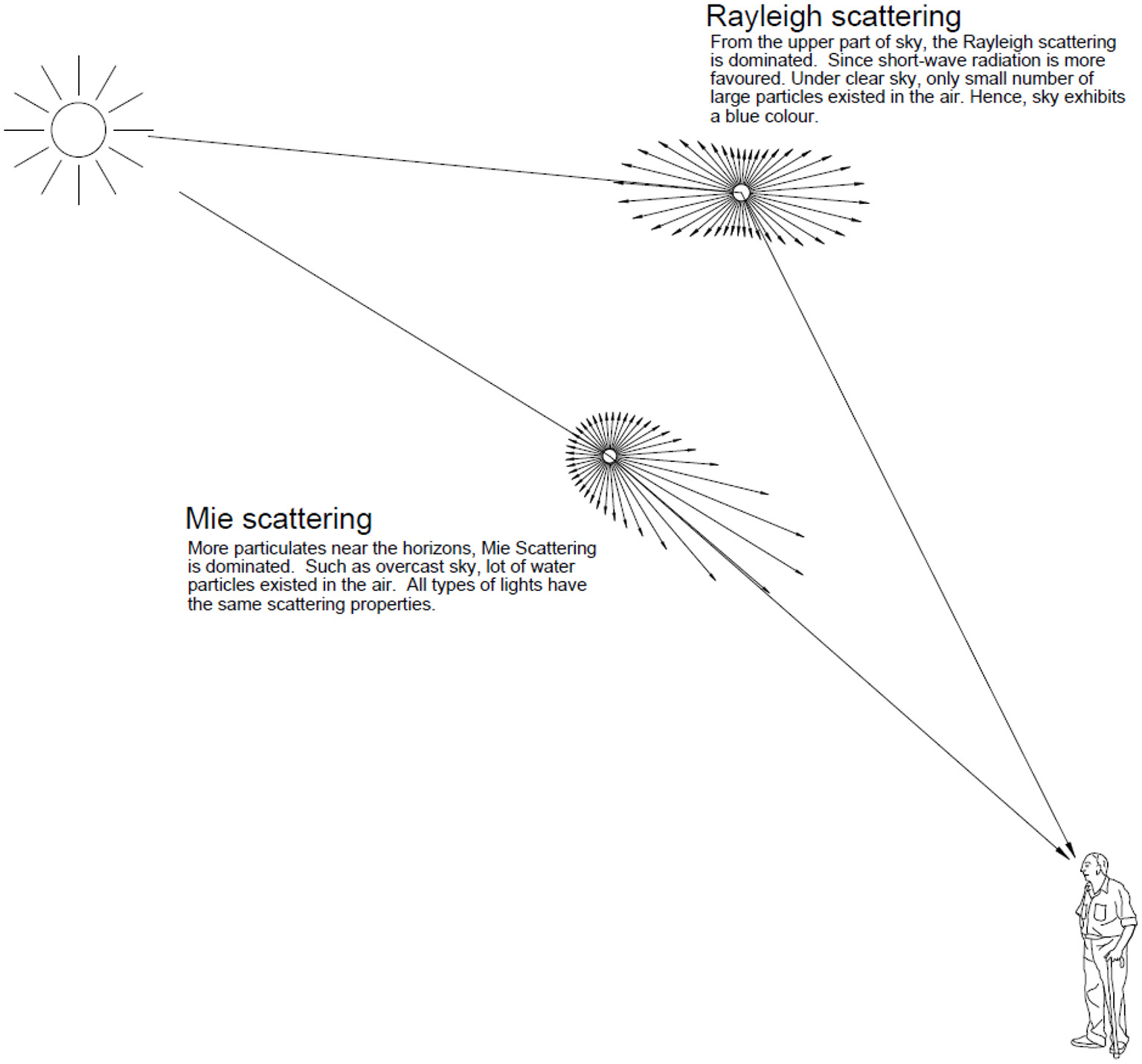 Rayleigh scattering and Mie scattering by an aerosol particle.