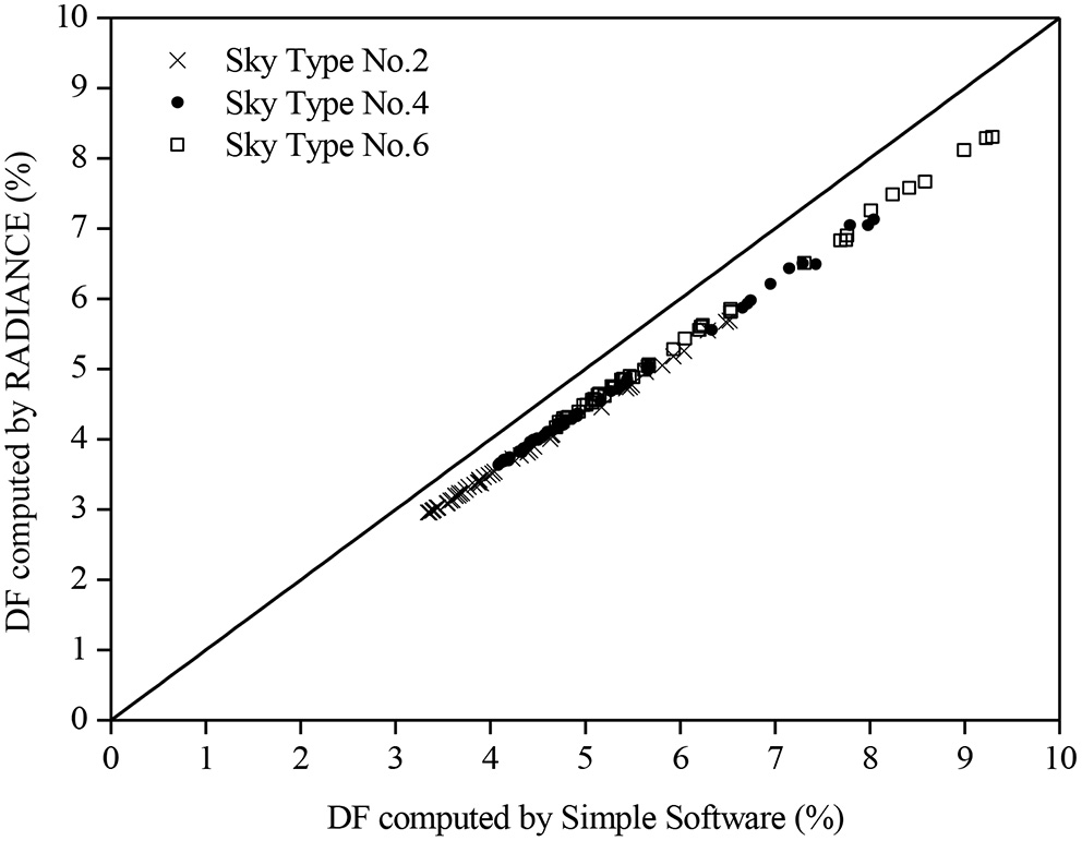 The daylight factors (DFs) simulated by RADIANCE and the simple software for skies 2, 4, and 6.