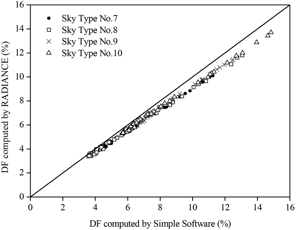 The DFs simulated by RADIANCE and the simple software for skies 7–10.