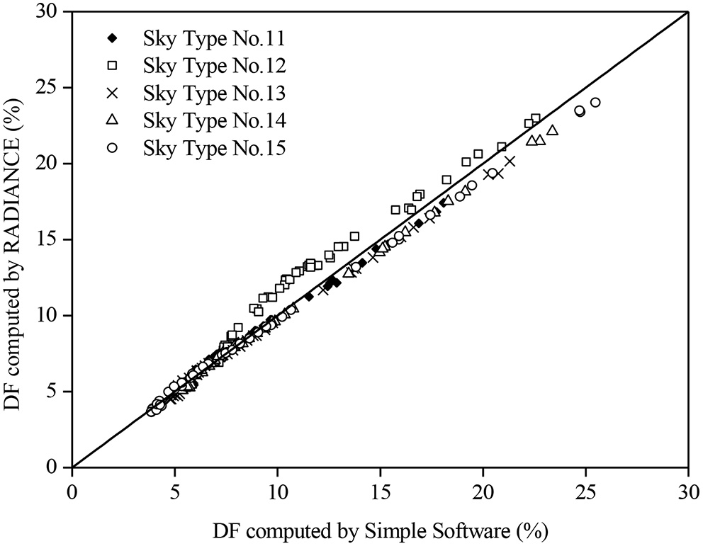 The DFs simulated by RADIANCE and the simple software for skies 11–15.