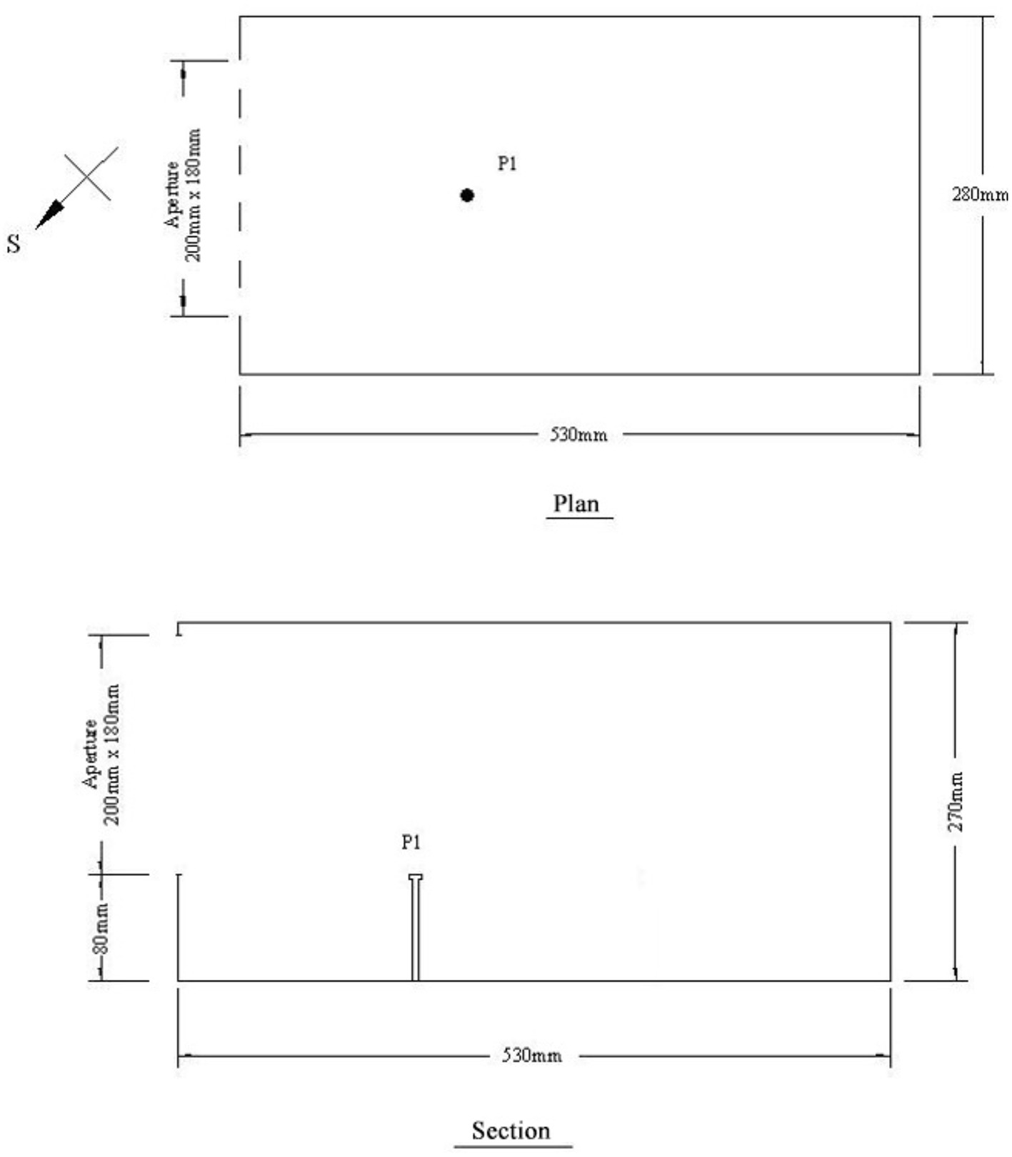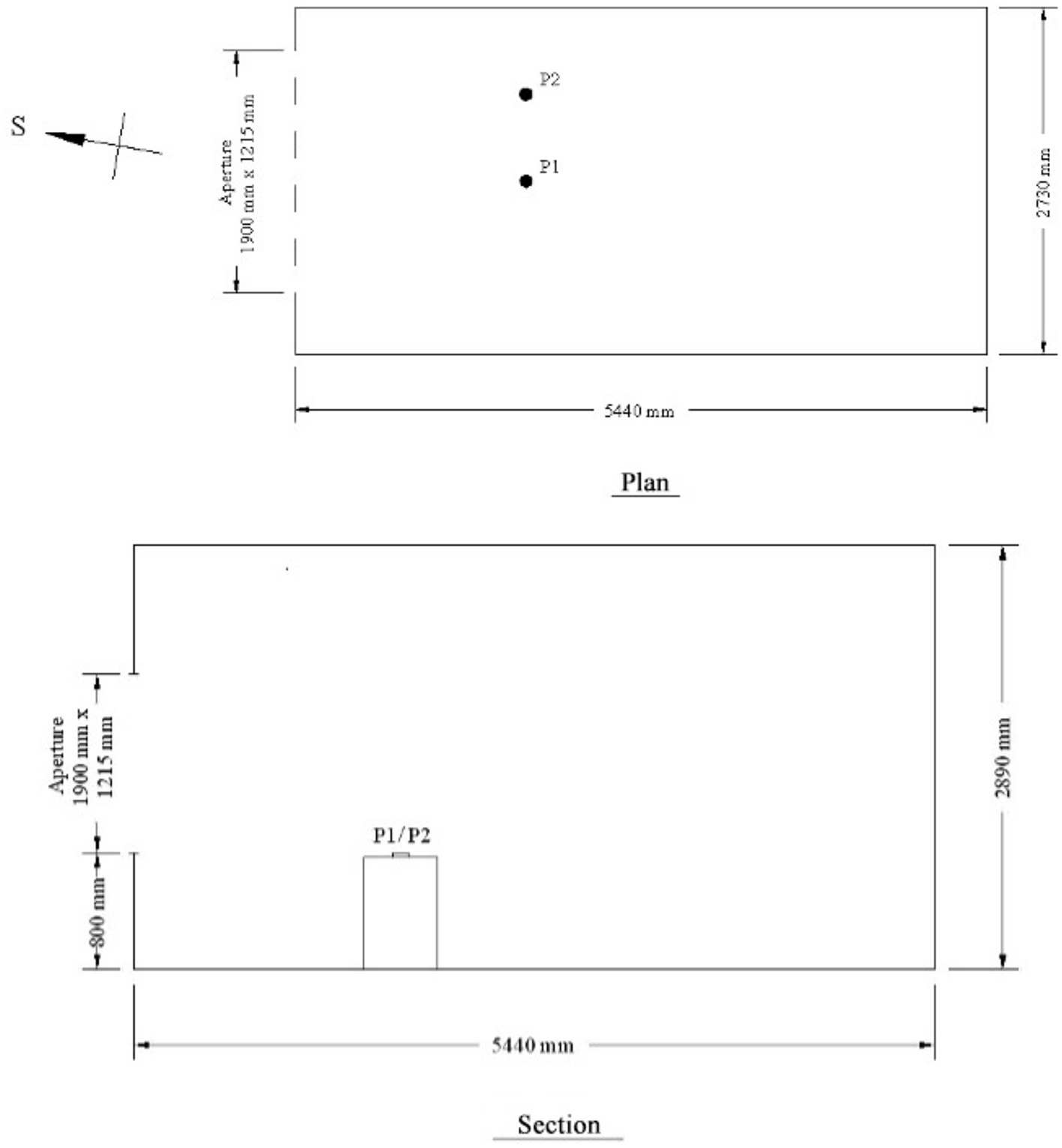 Plan view and section of the scale model showing the position of the measuring point.