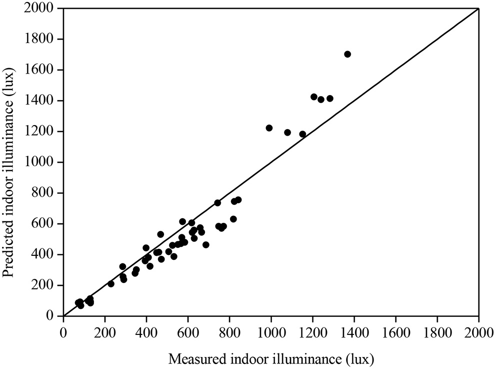 For skies 1, 3, and 5, their luminance distributions are not depending on solar azimuth, and the vertical daylight illuminance is invariant to room direction; thus, the determined DFs varied slightly for these three skies. The simulated DFs using the simple software for skies 1, 3, and 5 were 4.8, 5.9, and 6.8%, respectively. Slightly smaller DFs were obtained by RADIANCE ranging from 4.2 to 4.3% for sky no. 1, from 5.2 to 5.3% for sky no. 3, and from 6 to 6.1% for sky no. 5. The difference was just larger than 0.7%. Likewise, the DFs for the other CIE standard skies were computed. Figure 2 displays the results for the anisotropic overcast skies (i.e., skies 2, 4, and 6). With anisotropic sky patterns, the calculated DFs changed at various times of the day for different sky numbers. Using the simple software, the DFs were determined ranging between 3% at 1200h in March for north-facing window facade under sky no. 2 and 9.3% at 1500h in March for west-facing window facade under sky no. 6. Again, the DFs modeled by RADIANCE were slightly less than those obtained by the simple software. The peak DF difference was just <1% appearing in sky no. 6. Under non-overcast sky conditions, the sun effects become significant, resulting in larger DFs. The predicted DFs using the two programs for skies 7–10 (i.e., partly cloudy skies) are plotted in Figure 3. With the presence of direct sunlight, the ground-reflected component (C2) contributes to a greater amount of DF. The peak DFs for individual skies were found to be more than 10%. The DFs predicted by RADIANCE were still less than those obtained by our software but with smaller differences. As the amount of cloud further decreases, the ground-reflected component becomes more significant. Figure 4 presents the DFs estimated by the two simulation programs for the cloudless skies (skies 11–15). It can be observed that the DFs simulated by the two tools are in good agreement as dispersions in the plots are of a general order. Particularly for the DFs of low values, when the window facades face well-defined shadows, the outcomes simulated by the two programs are almost identical. More than half of the results simulated by RADIANCE were slightly more than those calculated by the simple software. The peak DF discrepancy obtained between the two programs was <2%. Given that most of the DFs were of more than 10%, the difference was not substantial. In general, the two simulation programs can produce similar DF results for the 15 CIE standard skies. Another criterion for consideration is the duration of the simulation. The simulation times for the 720 cases were 60 h and 4.5 min using the RADIANCE and the simple software, respectively. It indicates that the proposed software is useful at the early design stage where approximate daylight performance under various standard sky conditions is required. The accuracy of the simple software tool was further evaluated against data measured in a scale model (Li et al., 2006b) and inside a domestic unit (Li et al., 2006a). The model was 530 mm (depth) × 280 mm (along the opening) × 270 (height) representing a rectangular cellular office of 1:10 scale containing an opening area of 200 mm × 180 mm (without glazing) situated in Hong Kong (latitude 22.3° N and longitude 114.3° E). The plan view, the section, and the measurement points of the scale model are illustrated in Figure 5. The measurements were conducted on the rooftop. The model was put with the opening facing southwest (225°) where it is relatively free from external obstruction. Black paper of 0.08 reflectance was used to cover the model such that the SC was the main daylight source. In total, 50 readings were used for the evaluation. Figure 6 presents the simulated and measured results. It can be observed that the indoor daylight illuminance can be computed reasonably well under different skies by the proposed software. For some readings, the measured and simulated data are the same. Generally, the software tends to underestimate the daylight illuminance. The mean bias error (MBE) and root mean square error (RMSE) were respectively computed to be −8.4 and 14.9%. For the field measurement, it is a bed–study room situated at the 10th floor of a 13-story hostel block. The room is 5.44 m (depth) × 2.73 m (along with window) × 2.89 m (height) with the window façade facing close to south of 170°. The domestic block was built on the mid-level of a hillside, and the window walls mainly face an unobstructed outdoor environment. The working plane was at desk level of 800 mm from the finishing floor level. The room layout plan and the two measurement points are presented in Figure 7. In total, about 50 readings were made for each point. Figure 8 displays the measured and predicted results for point 1. The recorded interior daylight levels vary from 80 to 1,370 lux. Figure 8 displays the measured and predicted results for point 1. Likewise, the indoor daylight levels for point 2 were computed and are displayed in Figure 9. Since point 2 may receive less amount of daylight, the measured values were less than those in point 1, with the variations between 60 and 1,060 lux. The software tool slightly underestimated the daylight illuminance with the MBE of −2.6% and RMSE 14.5% of the corresponding recorded mean values.