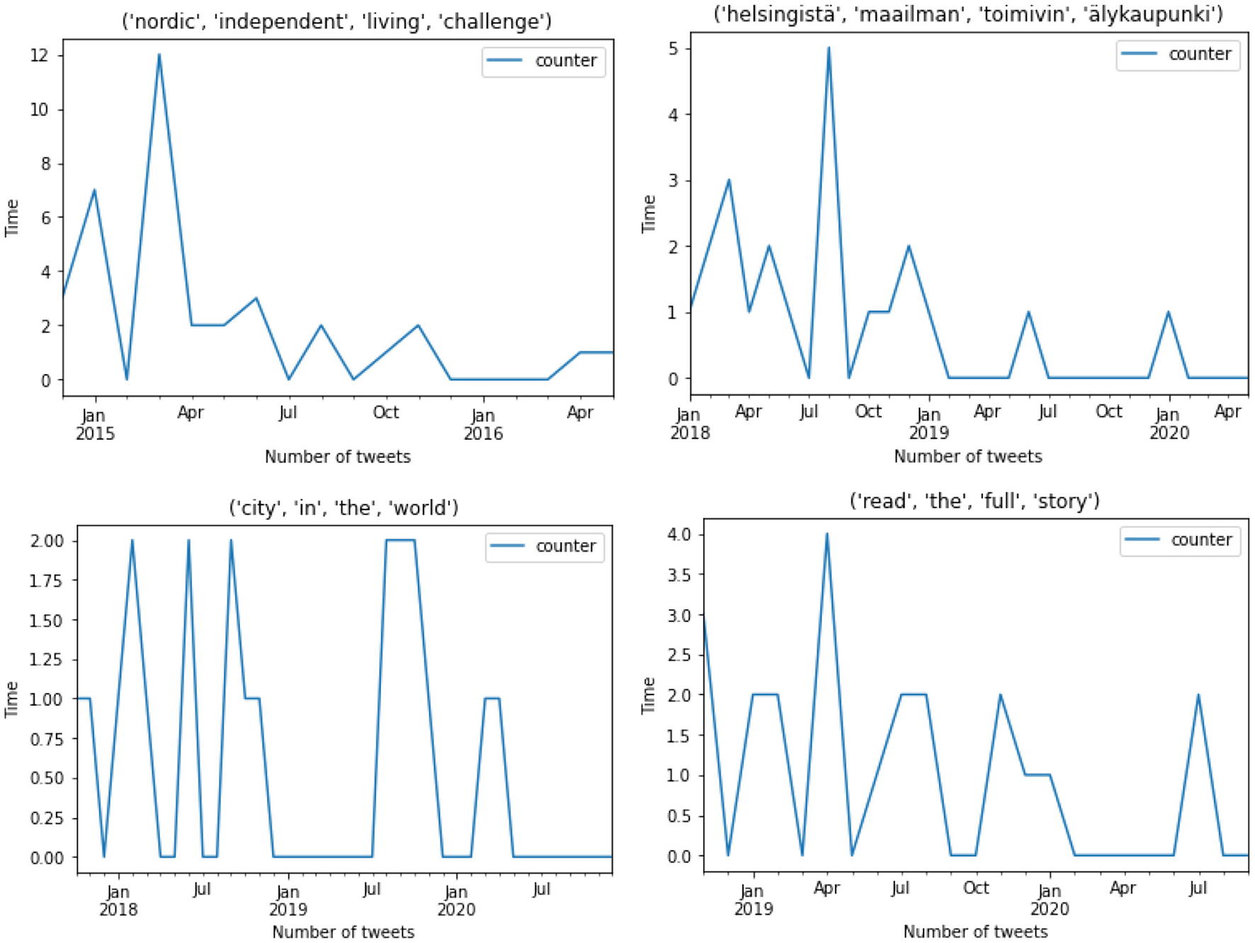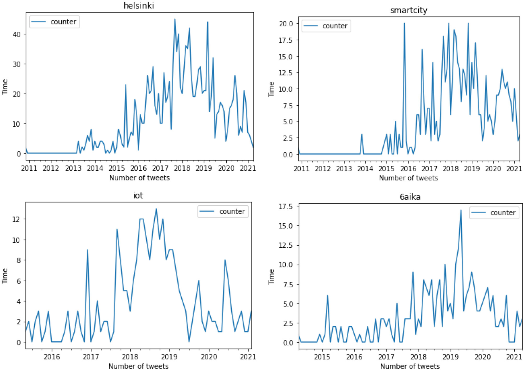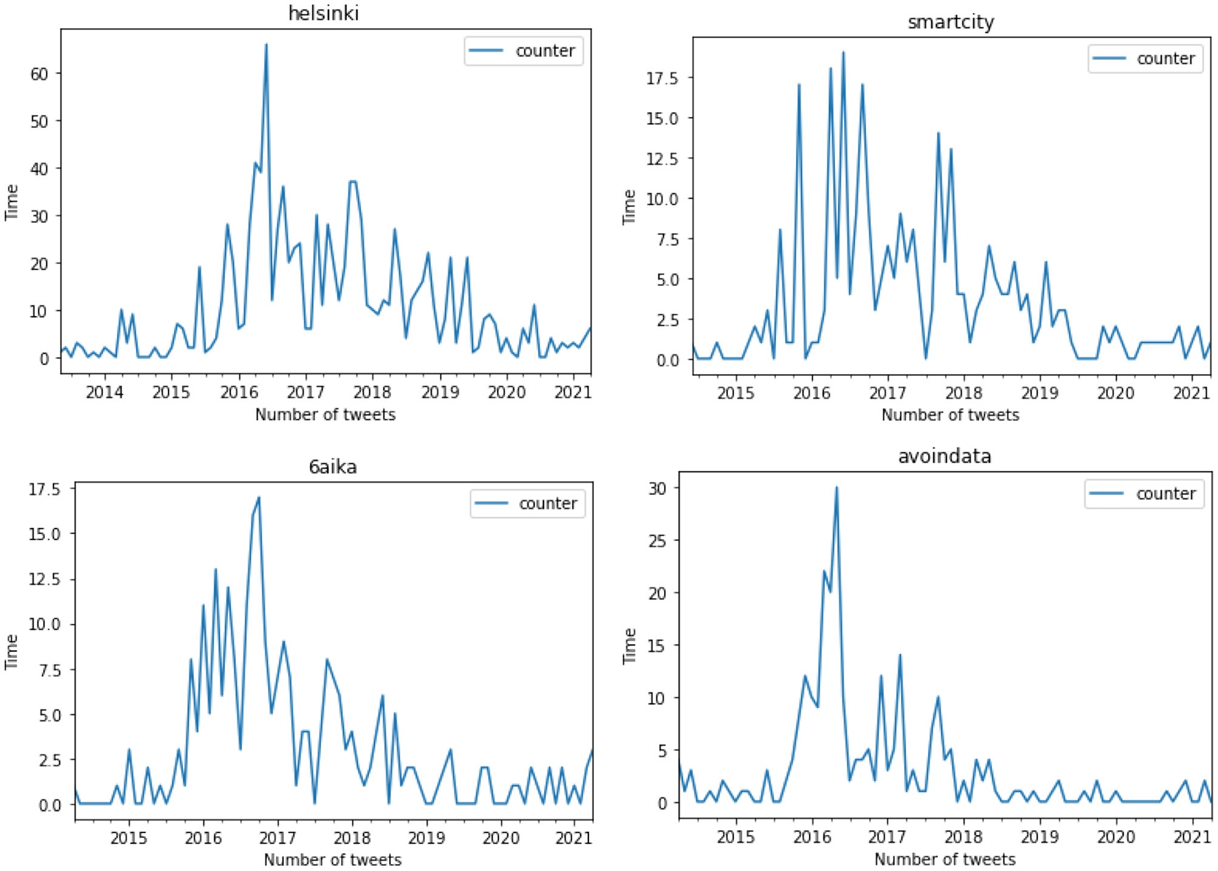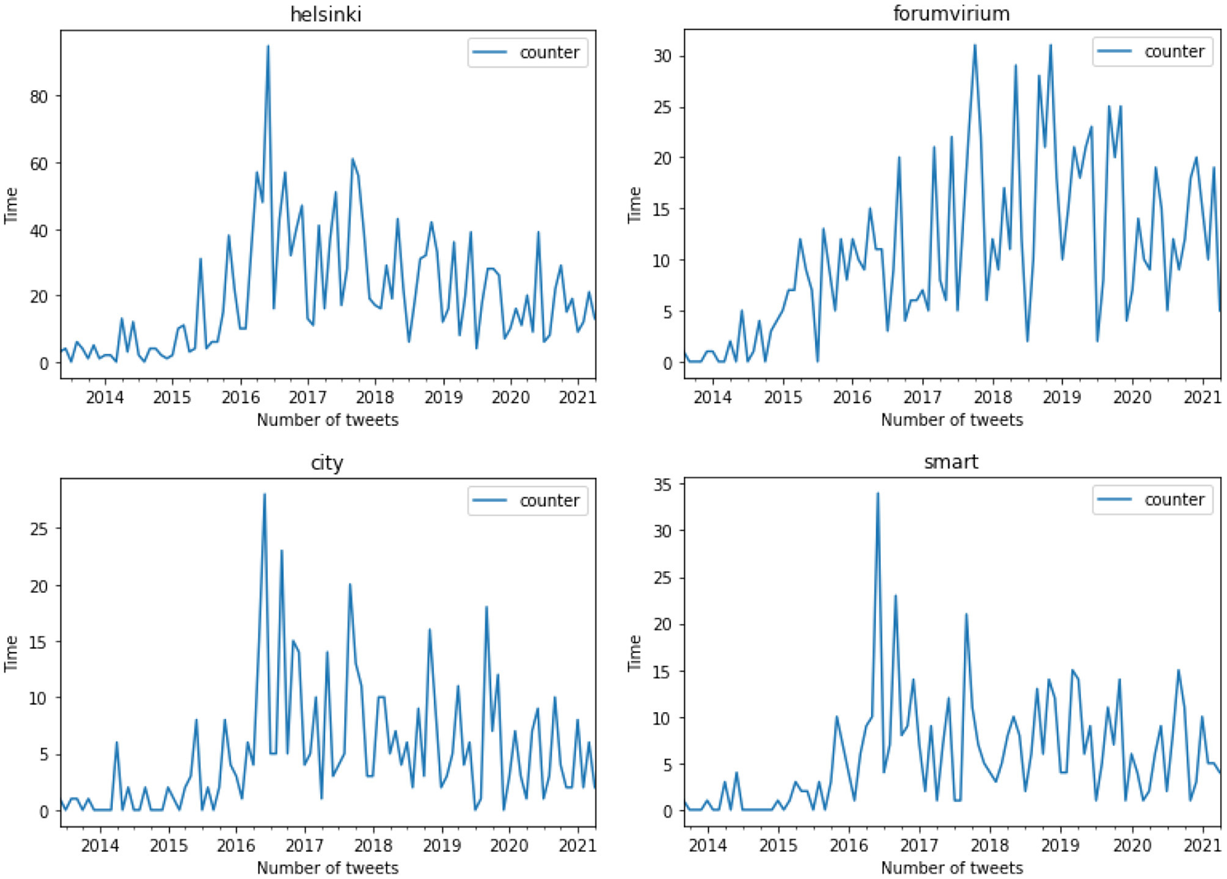 We applied for a license to use Twitter's Application Programming Interface (API) for researchers in March 2021. Using Twitter's Developer License and the Tweetsearcher tool developed by the University of Helsinki's Digital Geography lab, we were able to retrieve an original dataset of ~23,000 Tweets and Retweet via Python (Väisänen et al., 2021). We decided to source these Tweets from accounts directly linked to the City of Helsinki's smart urbanization agendas (Table 1). Our purpose behind this decision was 2-fold; firstly, while we acknowledge that Foucault's theory of power and knowledge structures power relations as horizontally networked rather than constructed as a vertical hierarchy, we assert that the city's power as an urban planning institution has partial responsibility for shaping not only discourses but the physical spaces they discuss (Mashhadi Moghadam and Rafieian, 2019). Thus, the city has a unique hold over imagined and constructed spaces in Helsinki that merits further analysis. The second reason is practical in nature. When mining Twitter data, deliberate choices must be made in order to limit what can become an endless stream of information (Sam, 2019). Thus, while this dataset excludes accounts held by individuals, public organizations, and the city of Helsinki's other Twitter accounts discussing sustainability in general terms, we are able to center on a specific perspective about the city of Helsinki's smart urbanization agenda. All posts by the accounts were pulled from their join dates until May 25th, 2021.
