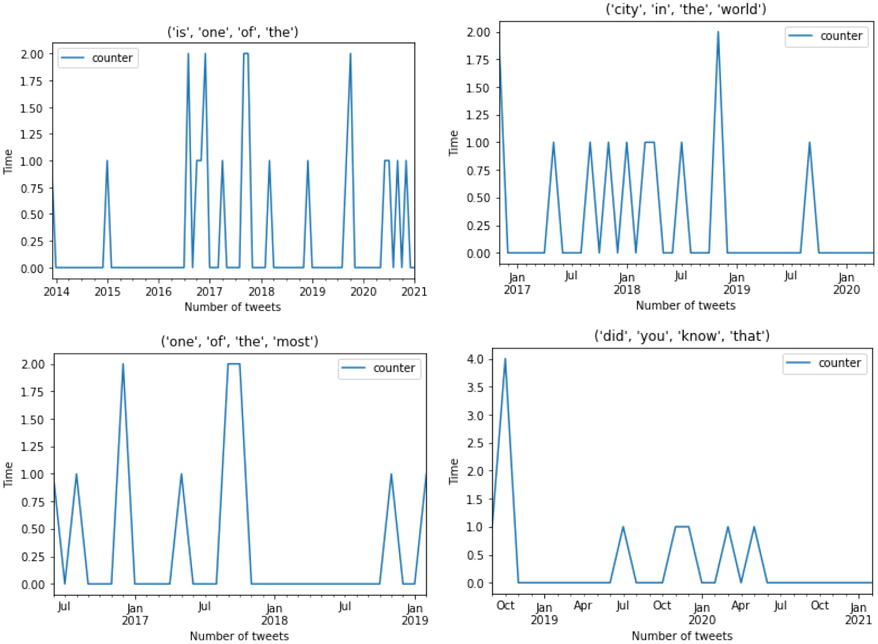 Iterative categories of most common fourgrams for Tweets and Retweets.