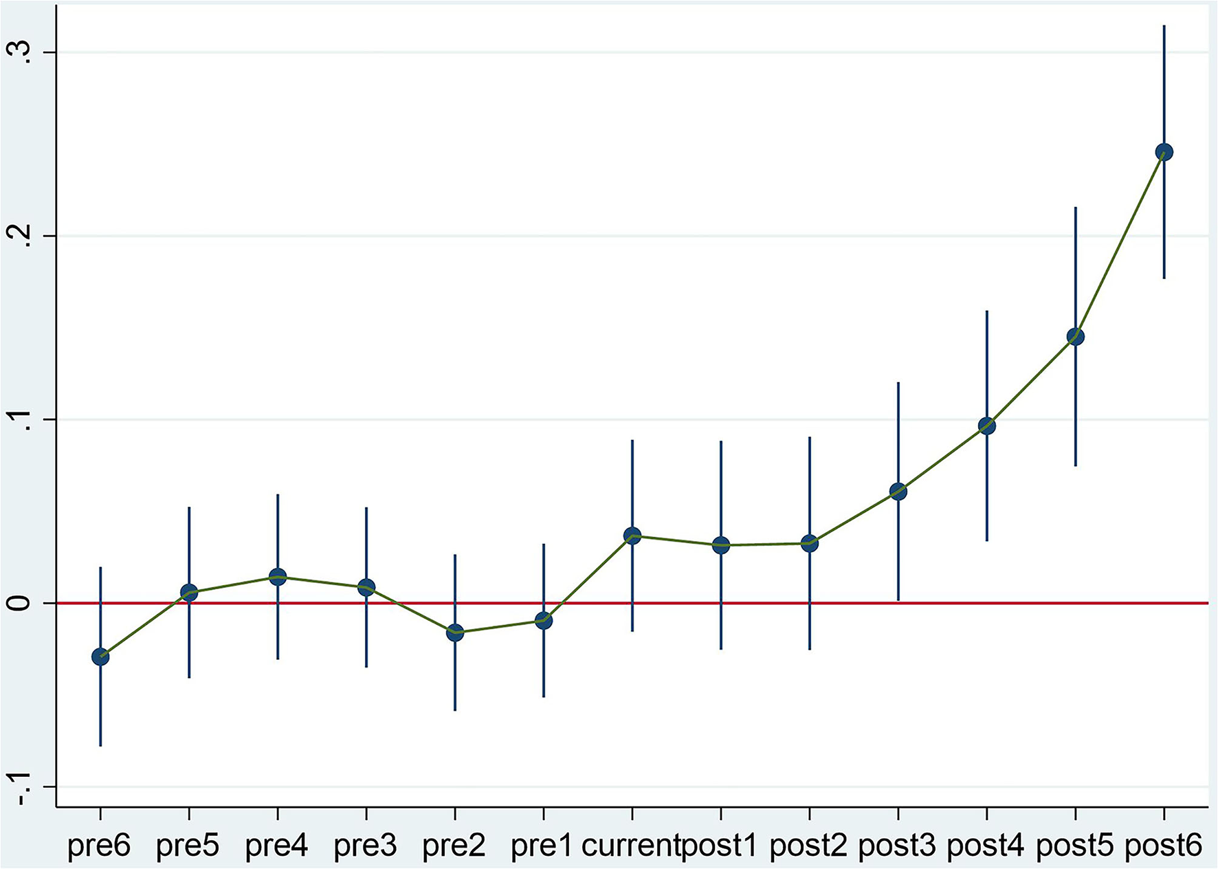 Figures 1, 2 show the parallel trend and dynamic change of doctor resource density and bed resource density, respectively, and their overall trends are consistent. The figure shows the estimated coefficient and 95% confidence interval of the virtual variables in each year during the observation window. It can be seen that the correlation coefficient between carbon emissions and policies in the first 6 years of HSR opening is close to 0. This shows that the doctor resource density and bed resource density of the treatment and control groups have a common trend before the implementation of the HSR opening policy, which means that there is no pre-correlation between the opening of the HSR and the level of medical resources. In the 6 years after the HSR, the correlation coefficients are all positive, and the absolute value of the correlation coefficients increases with time, which shows that the opening of the HSR can obviously promote the doctor resource density and bed resource density, and the longer the opening of the HSR, the greater the promotion effect.