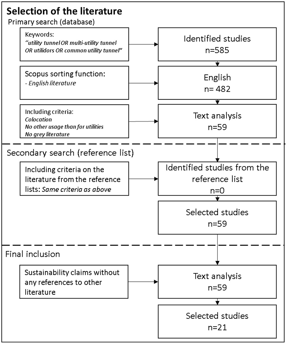 The primary search consisted of three steps identifying publications that focused on MUTs and then excluded those that were not written in English, those that were not scientific publications and those that did not primarily focus MUTs for collocation of several wires- and pipe-based infrastructure systems. Scopus, a multi-disciplinary database for scientific articles published after 1960, was used for the primary search and the literature search was conducted in the spring of 2020. The used search bar was “utility tunnel OR multi-utility tunnel OR utilidors OR common utility tunnel”, which reflects that a MUT can be referred to in different ways. Common synonyms are “utilidors”, and “common utility tunnel”, but sometimes only “utility tunnel” is used. This search yielded 585 publications in total. This was followed by the exclusion of all non-English literature, achieved with the help of the language sorting mechanism of Scopus and resulting in the exclusion of 103 articles.