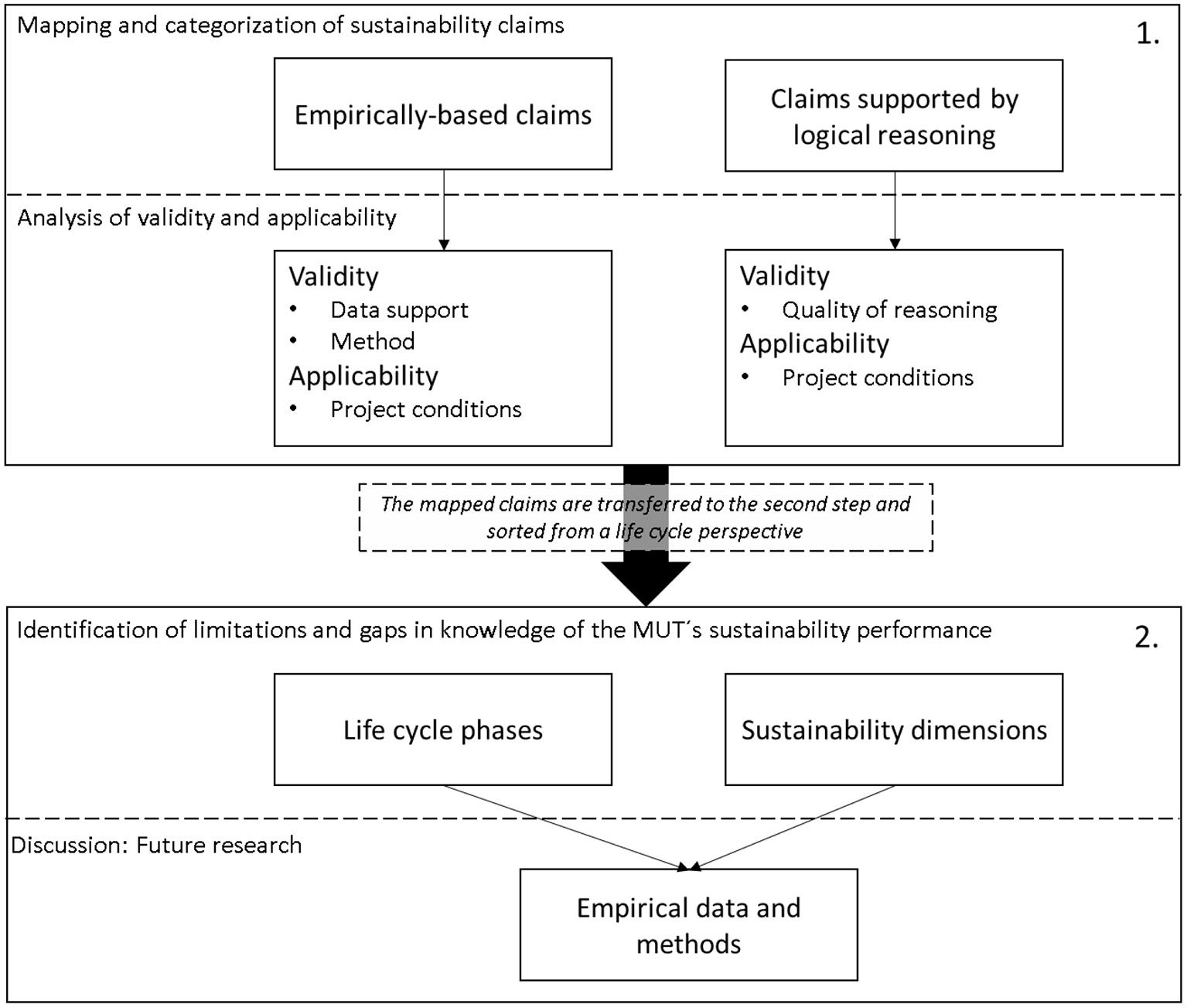 Scheme for the analytical approach of the review. The analysis consisted of two steps, where the first (1) focused on the validity and applicability of identified claims in the articles, and the second (2) on which life cycle phases and sustainability dimensions the previous claims addressed.