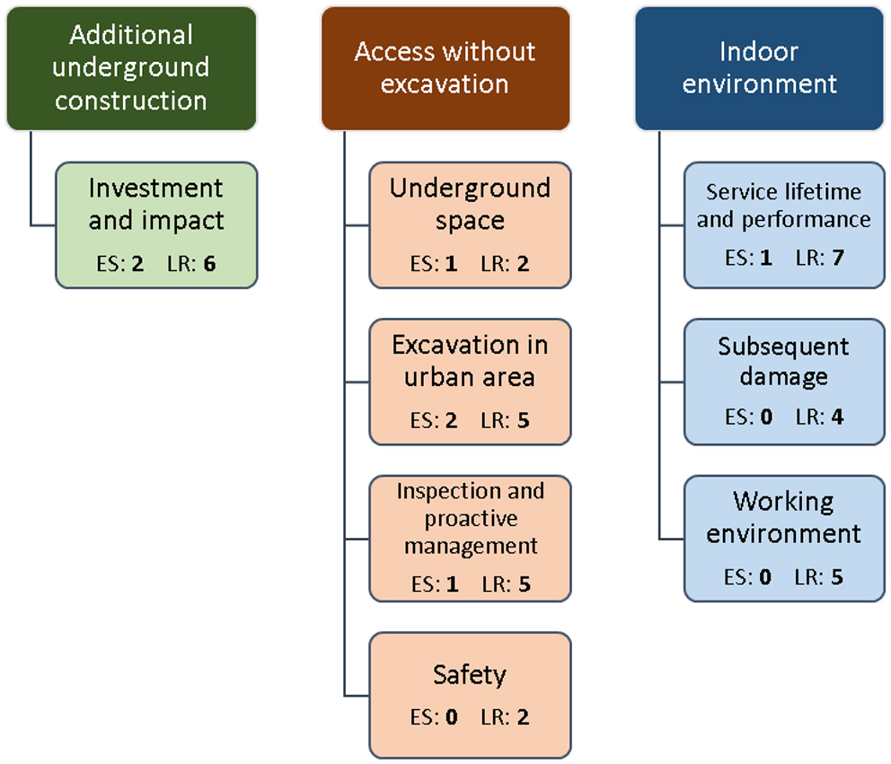 The third category, indoor environment, includes claims connected to how when using MUTs, the utilities are placed in an indoor-like environment inside the tunnel and not directly in the soil as for OCE. This category has three subcategories: service lifetime and performance (eight articles), subsequent damage (four articles) and working environment (five articles). The indoor-like environment of the utilities affects their durability and performance over time, and claims linked to this are categorized under service lifetime and performance. Claims dealing with increased risks for damage of the utilities when placing them in the same confined space are categorized as subsequent damage. If, for instance, a water main starts leaking, it may also negatively impact the other utilities in the MUT. Some articles also stress that conducting maintenance and renewal of cable and pipe based infrastructure in confined spaces such as in a MUT can be a risk for the workers, and these claims are categorized in working environment.