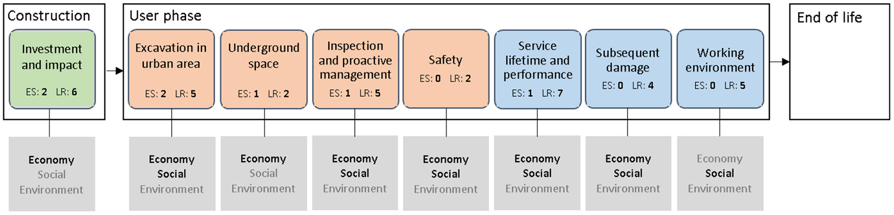 The earlier mapped and assessed sustainability claims presented along the MUT life cycle with the types of sustainability dimensions they are connected to (bold font). The economic dimension is the most studied and has implications for all claims except “working environment”. Social impact has been discussed for impact from the use phase, while the environmental one has only been discussed for “excavations in urban area”.