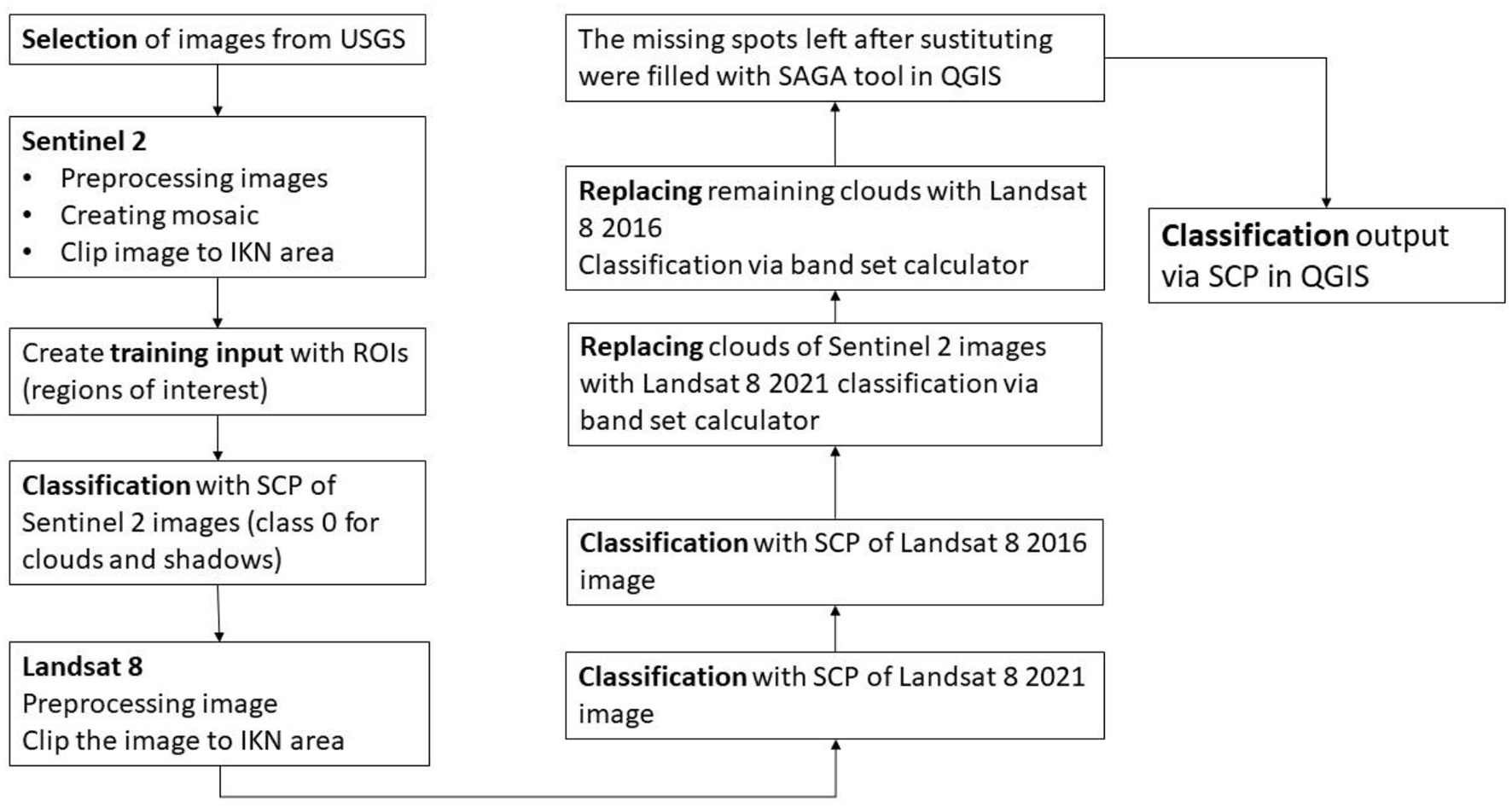 The classification process drew on the procedure utilized by Verstegen et al. (2019). The satellite images were visually inspected and compared with similar pictures from Verstegen's land cover analysis, google maps images and Google Street View. The land use classification process employed the SCP function in QGIS Version 3.16. for the Sentinel 2 images. With extensive region of interest (ROI) collection spectral signatures of different ROIs were inserted into the training input shapefile. Training input for the macro classes of water bodies (WB), mining area (MA), natural forest (NF), industrial forest (IF), palm oil (OP), urban built-up (UB), agriculture (AG) and grass / scrubland (GS) was defined and used for the consequent classification. Clouds and cloud shadows were further classified as 0 in order to be able to mask them and to insert classified areas from the Landsat 8 images into the empty spaces. Figure 2 displays the workflow of the entire classification process.
