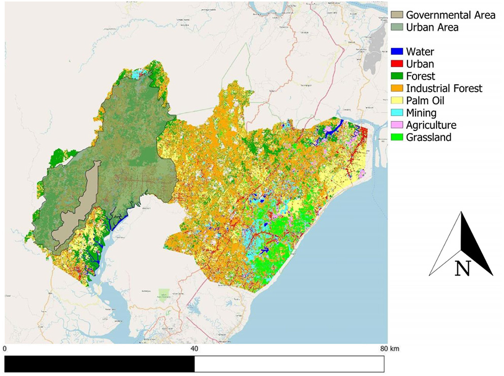 The status of the IKN is that there are different scenarios for the size and the specific boundaries, which range from a core area of the IKN of several hectares needs for the main government administrative buildings only, to a full size capital region covering an area of 256,142.74 hectares. We had to rely on the largest scenario to evaluate the largest possible impact. The boundaries of this region were derived from digitizing the informal maps issued by the government and connecting these to existing geospatial data available from open sources.