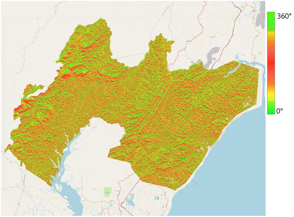 For the solar potentials, we also had to rely on the slope steepness and slope direction. The optimal angle of the alignment of the solar panel depends on the season and the location. The azimuth is changing over the day but also over the year. Indonesia has a relatively low tilt-angle of 7°-10° north-facing (Shakti Pumps, 2020). Building on a north-facing slope in the area, this must be taken into consideration. South-facing slopes must be excluded due to possible shading and loss of direct sunlight hours. Since the area to be developed is relatively close to the equator, the areas are excluded here only with a slope of 8° south and more. To generate the maximum energy output, the optimum angle for orientating must be determined. For the specific part of Indonesia, the optimum angle for summer (April—September) is around 20°. The optimum angle for winter is around 0°. The results in a north-facing tilt angle for the year of 8° (Shakti Pumps, 2020). One could indeed argue that solar potential fluctuates through the year, but we used the figures provided in the SolarAtlas as an overall guide to what is possible and feasible.