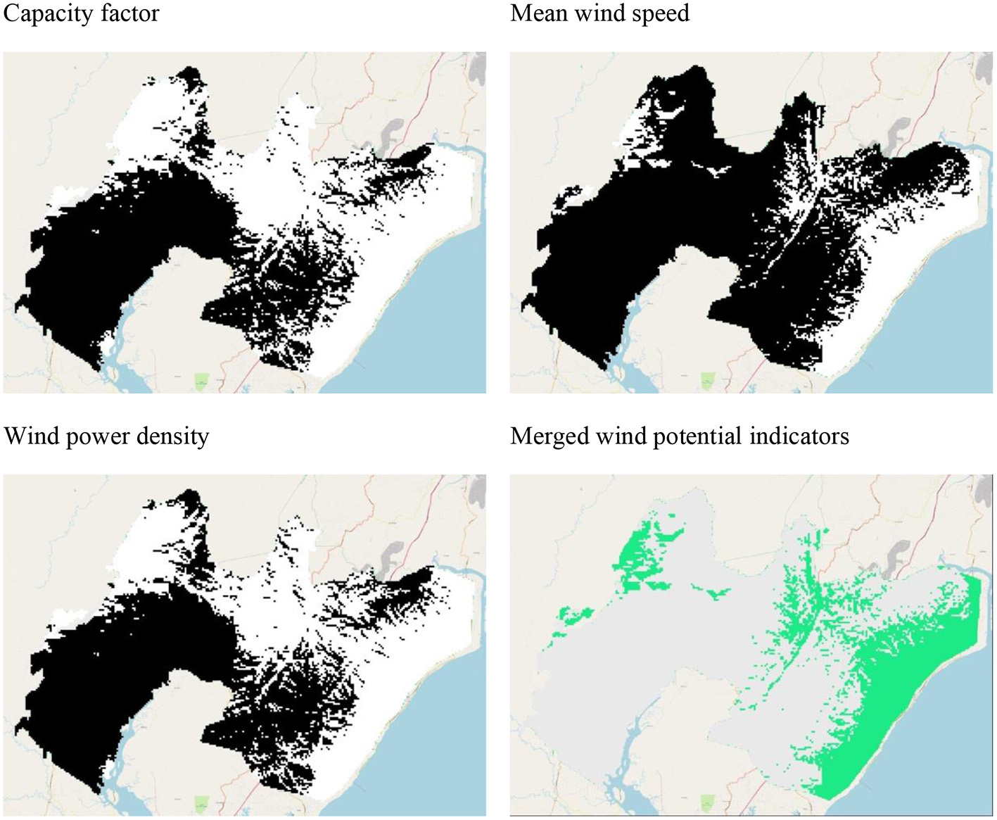 The Capacity Factor, the Wind Power Density and the Mean Wind Speed are largest at the northwest end of the IKN area. However, the roughness factor is too high in this area due to the hilly land. This analysis goes hand in hand with the slope map. Similar to the northwest are the potentials for wind energy in the eastern part of the area. Wind speed is higher because of the proximity to the ocean. The capacity factor is around 0.15 until 0.2. The wind power density lies between 50 and 80 W/m2. The mean wind speed per year is around 4 m/s. The roughness length is the lowest in the eastern area. If restricting oneself to the eastern part of the new capital to project wind turbines, one must reckon with the following basic conditions. To exclude zones with poor potential for wind turbines, the following parameters were set.