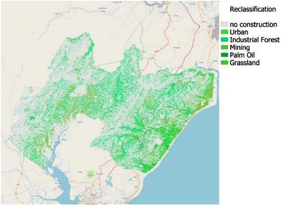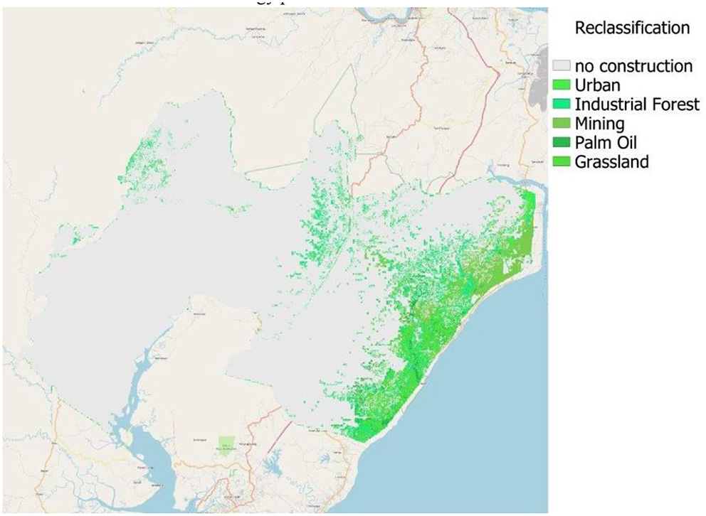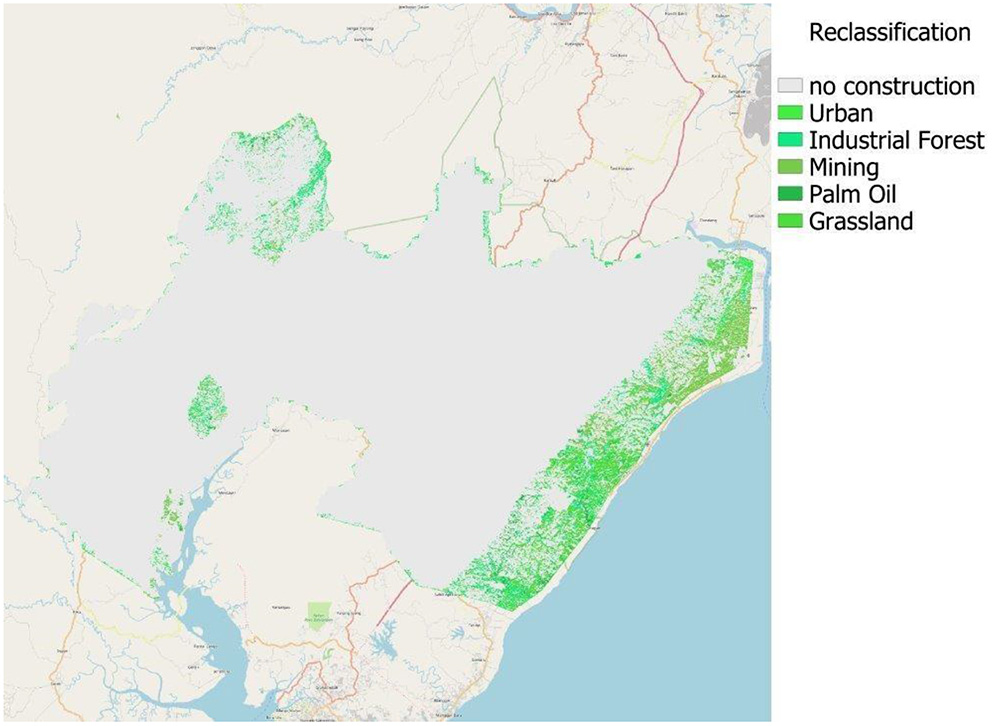 For the city development, urban growth scenarios and land use changes were derived from the study and associated datasets of Hackbarth (2021). This study compared the CLUE-S model and the FUTURES system, which are both operational within Grass GIS, and opted to rely on the latter given the active support on the one hand, and the possibilities for scenario development (Petrasova et al., 2016). It requires at least two LULC maps (Meentemeyer et al., 2013), which can be directly utilized by QGIS. For the simulation of the urban expansion patterns after the construction of the new capital one has to rely on the land cover situation in the area after a given planned building stage as a point of reference. In this first construction phase in 2024, there is only the main government campus planned. This is however suitable for the expansion model as a starting point of reference. For the expansion, it is possible to use the r.sample.category2 and the v.net function3 in Grass GIS, which creates a randomly generated street network within the planned urban development area. Afterwards, a random road network can then be calculated with the v.net function by connecting the various points within the boundaries of the total area available. To a certain degree these road expansions already exist when visually inspecting the satellite images, as these are informal paths to access existing or past palm oil and timber plantations.