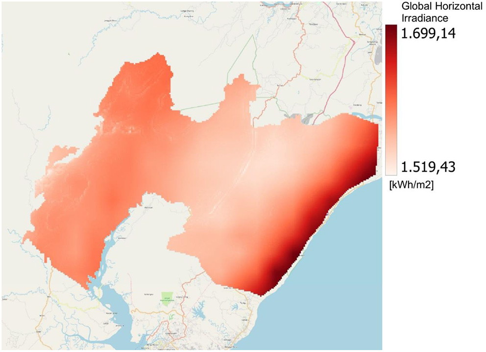 For the establishment of how and where renewable energy could address the energy needs, we had to rely on the Global Solar Atlas, released for the solar potentials in Indonesia. The Atlas, published by the World Bank Group, funded by ESMAP, and prepared by Solargis. Solargis develops and operates a platform to access historical, recent, and forecast data (Global Solar Atlas, 2019). It calculates the PV output, i.e., the assessment of power production potential for a PV power plant with freestanding fixed-mounted c-Si modules, mounted at an optimum tilt to maximize yearly PV production.