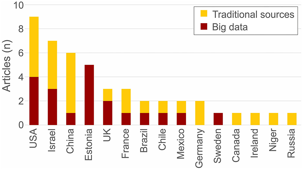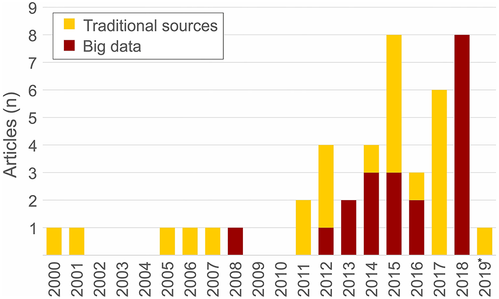 When presenting results, we make a distinction between traditional data sources and big data sources. These are ambiguous terms that lack clear definition, yet are different from each other in terms of the qualities and characteristics of data (Kitchin, 2014). While the most common characteristics of big data are velocity (being produced continuously) and exhaustivity (n = all samples), traditional data sources are beyond some exceptions, such as register and census data, collected with sampling techniques, and have therefore limited volume, and spatial and temporal scope (Kitchin, 2014; Kitchin and McArdle, 2016). Here, we consider digitally produced data sources, such as mobile phone, social media, and smart card data, and data produced via mobile phone applications and collected via GPS tracking studies, to constitute big data. We consider census and register data, and data collected with surveys and interviews as traditional data.
