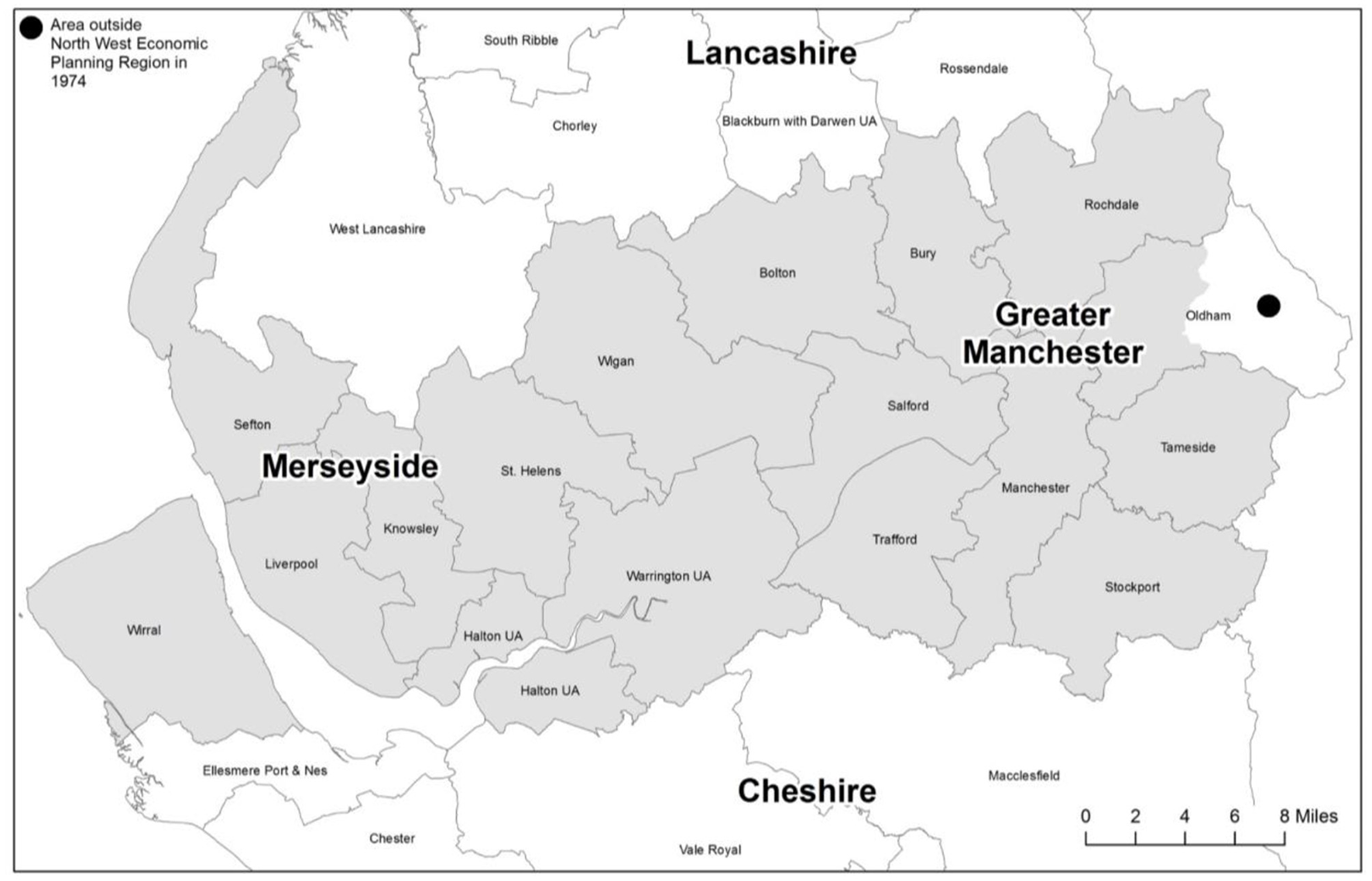 The Mersey Belt in the North West UK. Map drawn by Nick Scarle, University of Manchester. Shaded areas are those local authority areas considered to be in the Mersey Belt in 1974.