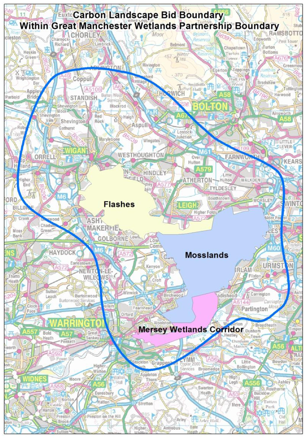 Carbon Landscape and Greater Manchester Wetlands boundaries. Source: carbon landscape project. Blue line indicates the GMWP geography. The Carbon Landscape area is shown in cream, pink and blue, showing the Flashes, Mosses and Wetlands sub-areas. These sub-areas are based on landscape character assessments. Source: Great Manchester Wetlands Partnership.
