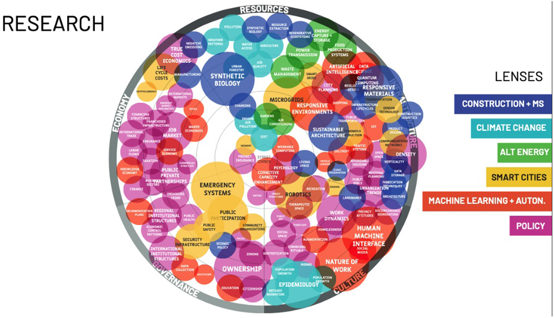 The five primary categories were complemented with focus areas identified as important to the project at hand. With the FWV megacity project's engineering audience, focus areas were identified through collaborative workshops as climate change, high tech construction and material science, policy, alternative energy, and artificial intelligence and autonomy.