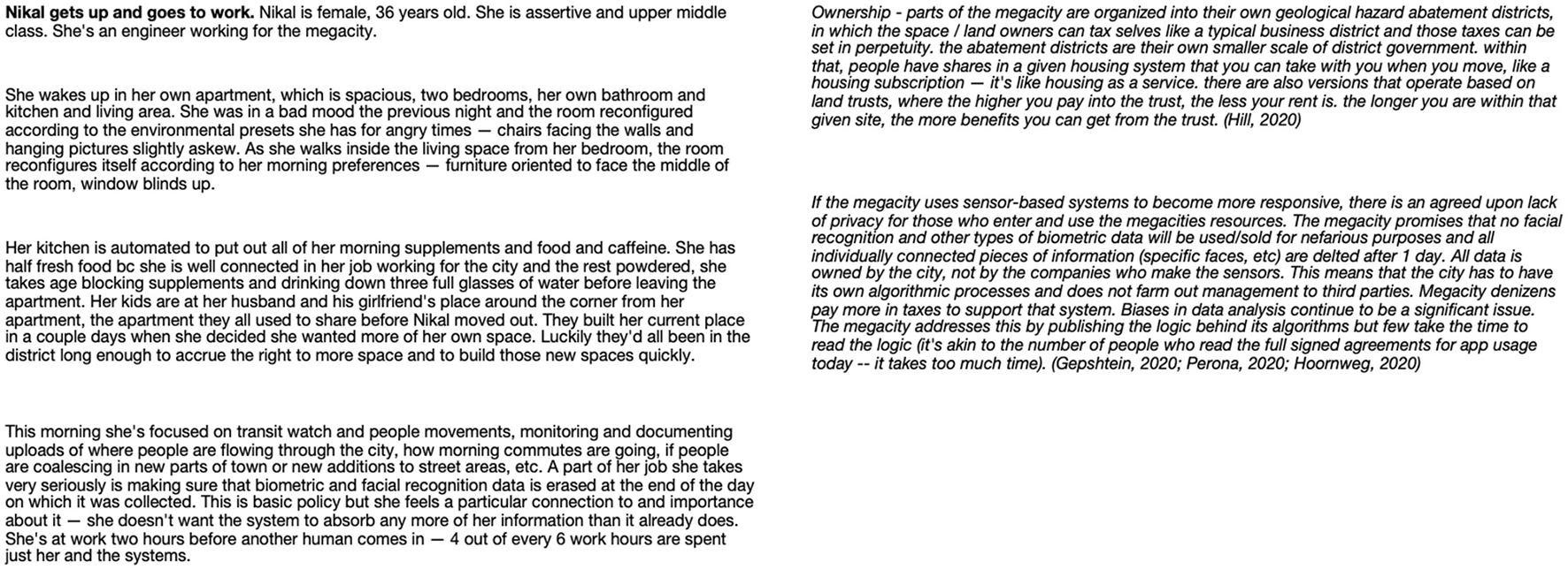 Written narratives for the FWV mega city project were a means to test the human impacts of design proposals and refine them accordingly, through a narrative form of rapid prototyping (see Figure 2). Investigating the kinds of energy grids that could power a city of fifty million in safe, carbon neutral ways, for example, came hand in hand with understanding how those grids would impact what residents saw when they left their homes each day. While primary and secondary research guided the big picture context for what urban life in 2070 could become, written narratives connected big picture context to human-centered concerns.