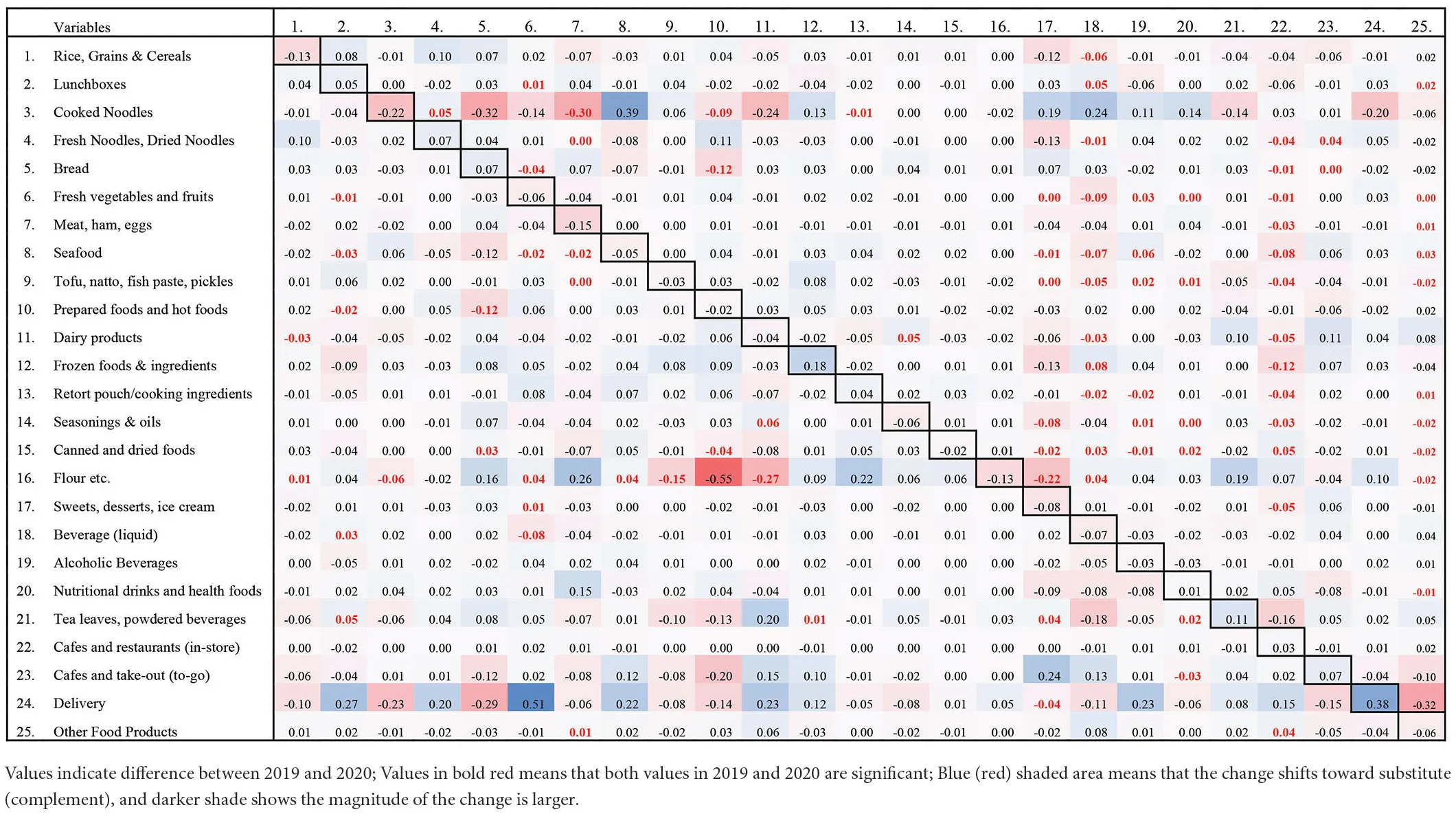 In previous literature for economic studies, hedonic price analyses exist that measure the impact of lockdown policies and COVID-19 on food prices (Dietrich et al., 2021; Hillen, 2021; Ruan et al., 2021). The possibility of an impact of COVID-19 on food demand has also been discussed (Cranfield, 2020), but there are few empirical studies of the impact on food demand. A study examines online demand for food in Taiwan, which finds a 5.7% increase in sales and a 4.9% increase in customers when additional cases of COVID-19 confirm in the online food market in Taiwan (Chang and Meyerhoefer, 2021). There is also a study using demand system analysis that examines the impact of the lockdown on the demand for food losses before and after COVID-19 (Vargas-Lopez et al., 2021). However, no studies have analyzed the demand for food in general and its substitutive and complementary relationships. In the case of Japan, where the lockdown was not legally imposed, it is necessary to understand the impact of COVID-19 on food consumption, including the relationship between food items.