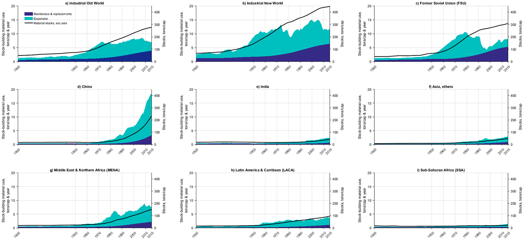 Material stocks in nine world regions and their expansion versus maintenance and replacement flows in the period 1900–2015. Source: (Wiedenhofer et al., 2021). Courtesy of Dr. Dominik Wiedenhofer, Institute of Social Ecology Vienna (SEC), Department of Economics and Social Sciences (WiSo), University of Natural Resources and Life Sciences, Vienna (BOKU).