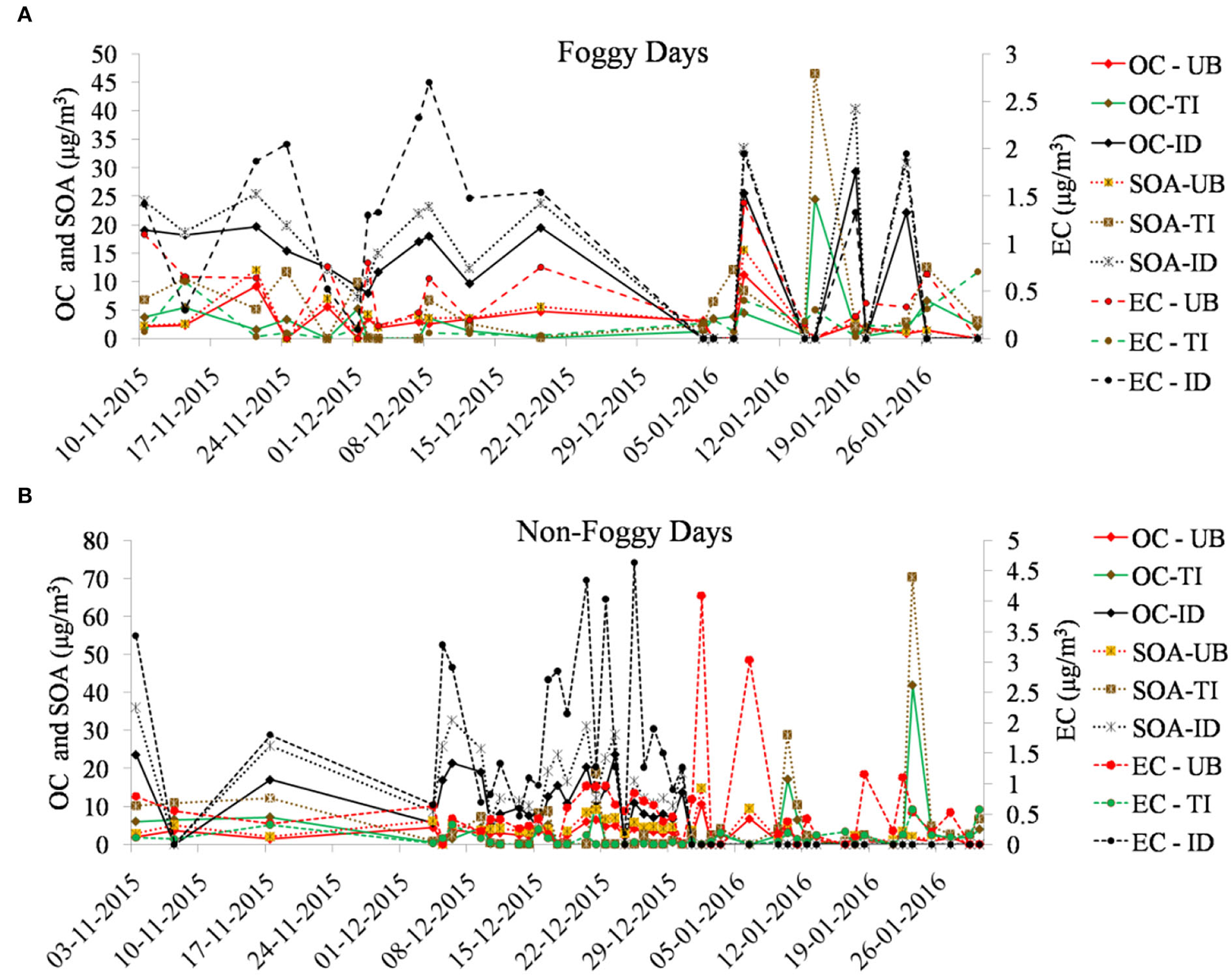 Time series of the carbonaceous components during (A) foggy days and (B) non-foggy days.