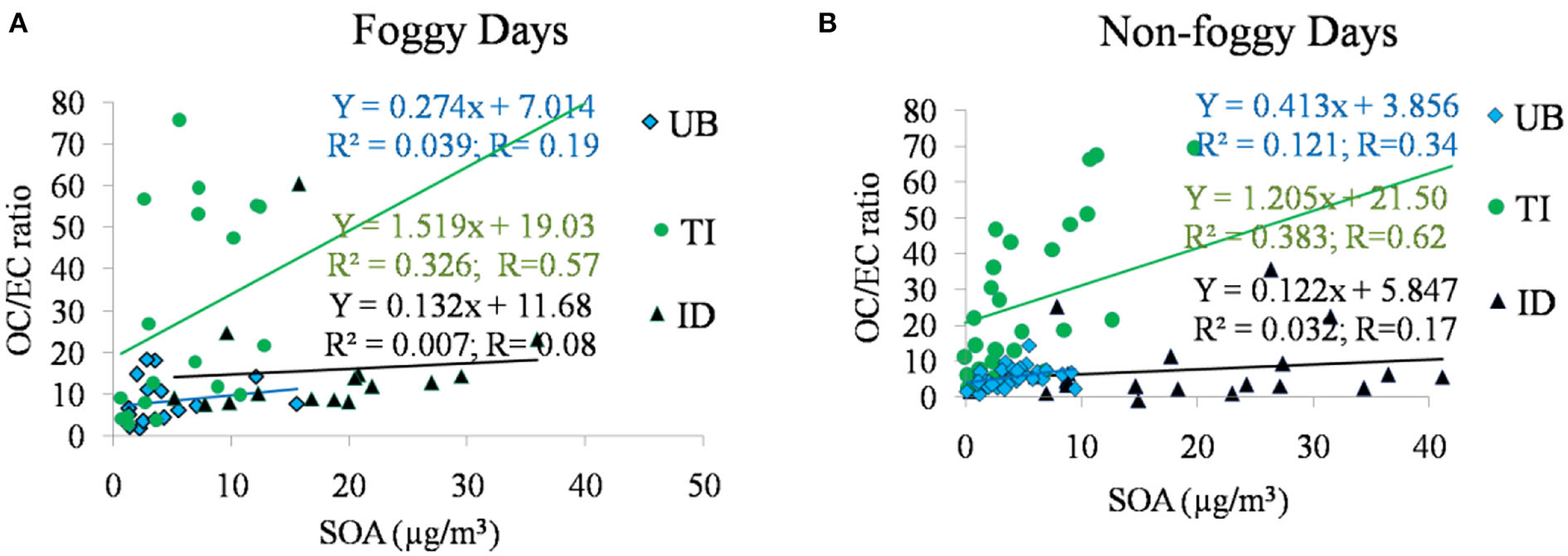 Correlation observations found that SOA was strongly positively correlated with OC and moderately positively correlated with EC. The lower temperature also favors SOA formation due to the shifting of gas-to-particles conversion toward the particle phase. However, relative humidity had no detectable influence on SOA production. AT was observed with a significant moderate negative correlation with OC and a negative weak correlation with EC. Scatter plots between SOA and OC/EC ratio indicated that the TI site was observed with a moderate positive correlation, while ID and UB sites were observed with a poor correlation on foggy and non-foggy days both.