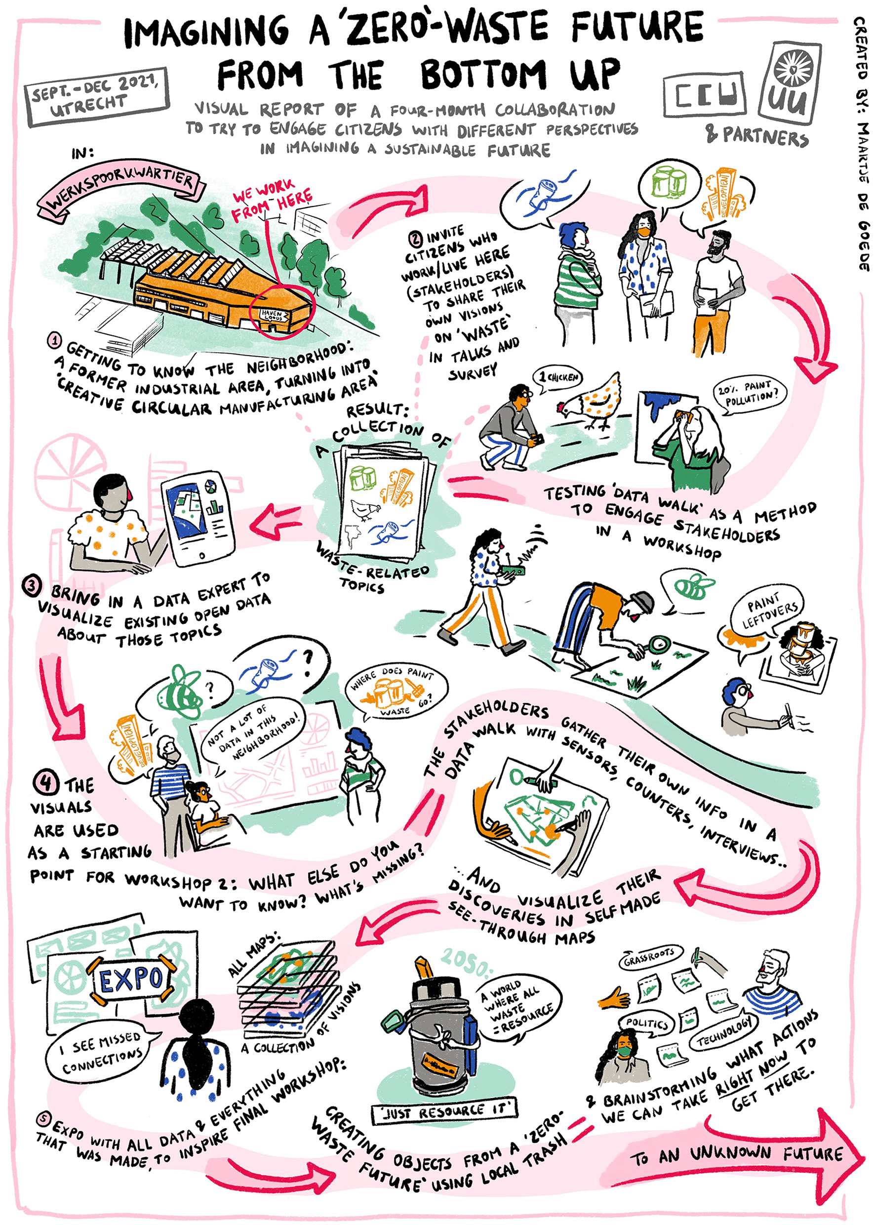 To provide an overview of our research process, below, we include snapshots of our methodological steps. The CCU-affiliated social designer, Maartje de Goede, also “translated” these steps into a visual report for an accessible and engaging overview (refer to Figure 4).