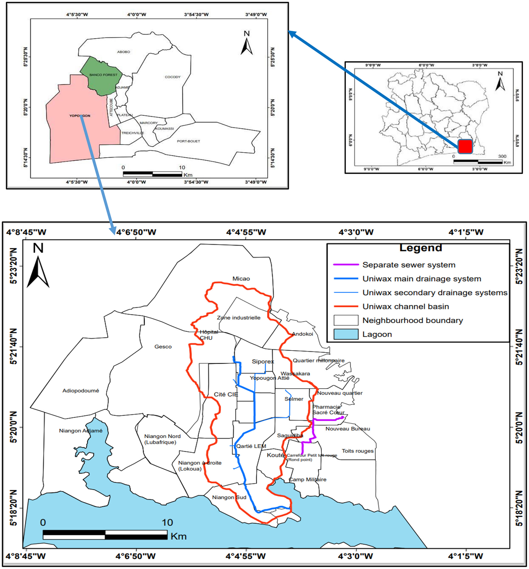 Abidjan is the economic capital of Côte d'Ivoire. It is located in the south of the country between latitudes 5°00' and 5°30' North and longitudes 3°50' and 4°10' West. It covers an area of 577.35 km2 of which 89.81 km2 is a lagoon, i.e., 16% of the surface area (Koffi et al., 2012). With an estimated population of 4,693,912 inhabitants (INS, 2014), it comprises 10 municipalities. This city has a 2,000 km separate sewage network.