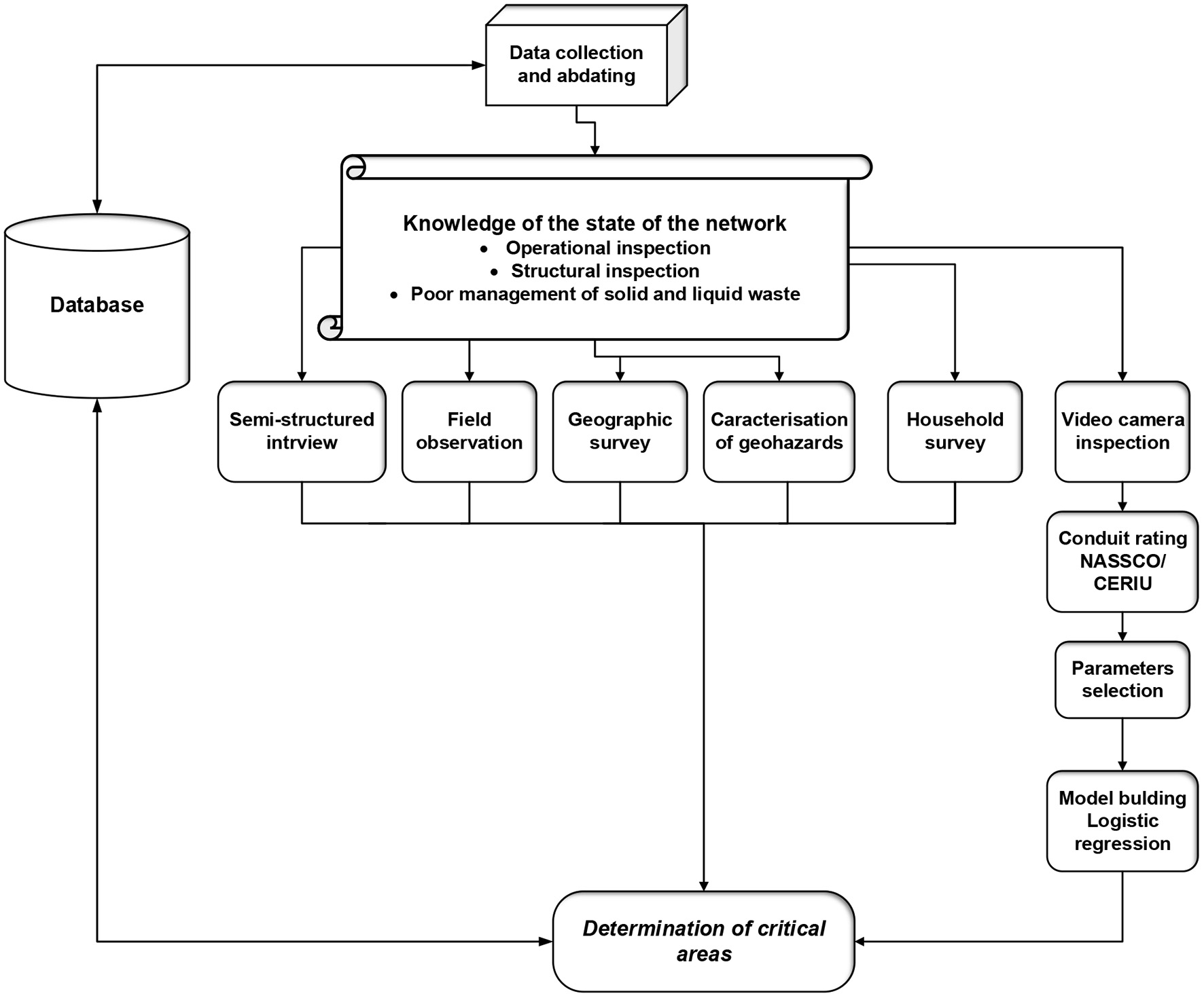 In this research work, the 21/22 collector of Nouveau quartier in Yopougon was selected and has not been systematically studied since 1975. As for the Uniwax drainage system, previous studies have been carried out on the system, but these studies were limited to the characterization of the wastewater. The analysis was based mainly on interviews and field surveys, namely: semi-structured interviews, direct field observation of the state of operation of the wastewater and storm drains, geographical survey and a survey of the inhabitants of the district, using a systemic approach to assess the state of the sewage system over the last decades. A video camera survey was also carried out to identify structural factors. The methodology was successfully applied to two sewers in the city of Abidjan, Cote d'Ivoire. Figure 4 below illustrates the methodology used in this work.