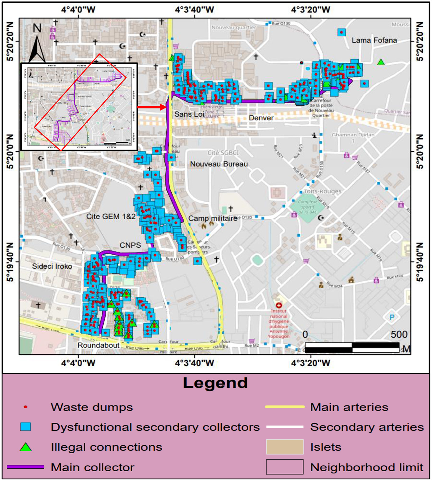The field observations was conducted during two different periods of the year. The first phase occurred during the dry season in March 2021. The second phase was conducted during the rainy season in June 2021. This process involved exploring all the areas concerned with a digital camera, to capture images of environmental problems found, a notepad to record all the problems observed and a GPS receiver to record the precise positions of the environmental problems found. Also, this step assisted in the observation of the different forms of waste around the sewerage systems, the morphology of the dysfunctional areas, the state of the wastewater and stormwater drainage infrastructures as well as the management of household waste, wastewater and urban activities in the different neighborhoods located along the networks.