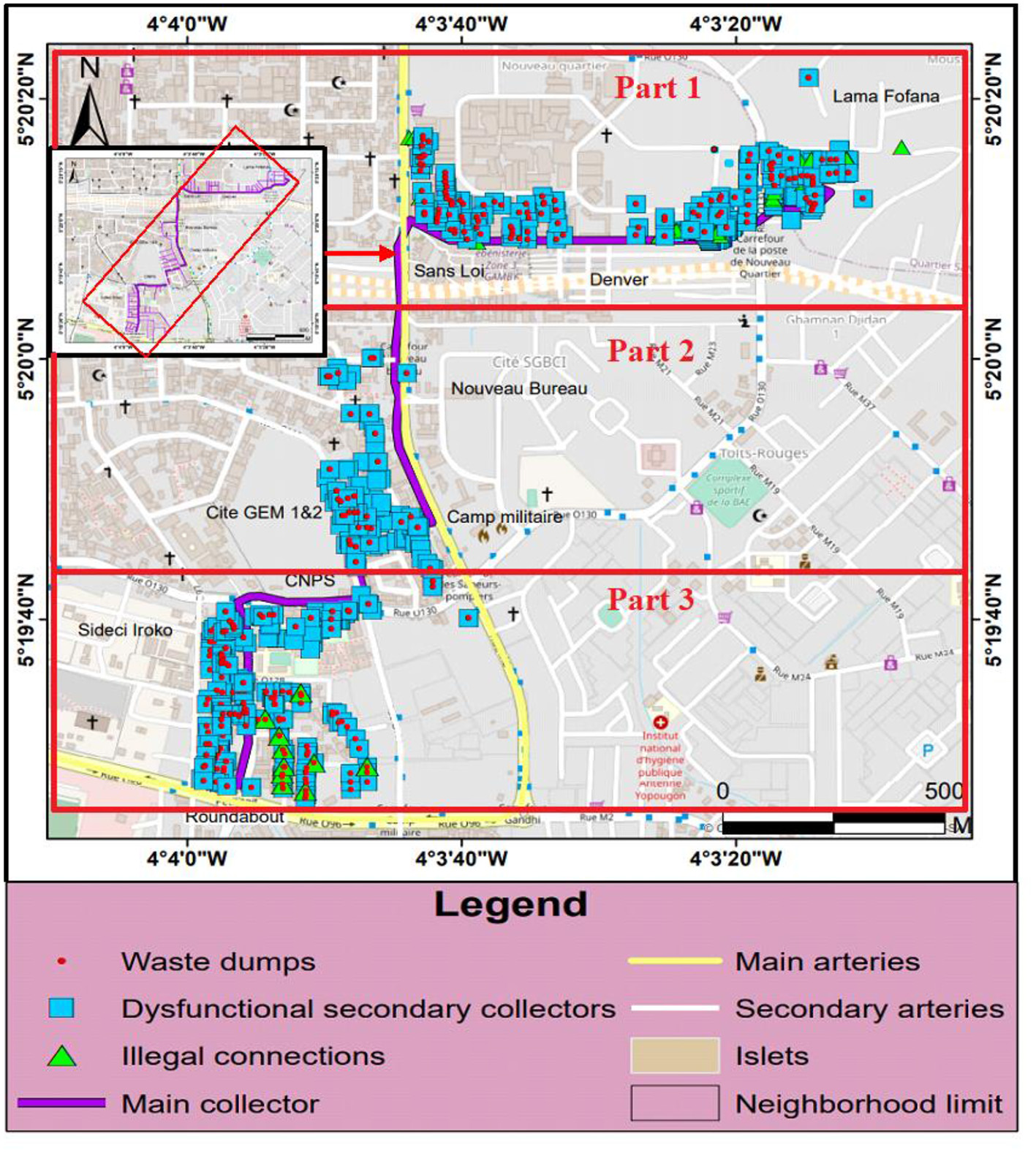 This approach aided in the understanding of the environmental problems studied, which were then used for the elaboration of the data sheets of the geographical survey. During this phase, data on the reaction of the population and the representatives of the neighborhoods to the manifestation of the problems linked to the degradation and the failure of the systems was collected.
