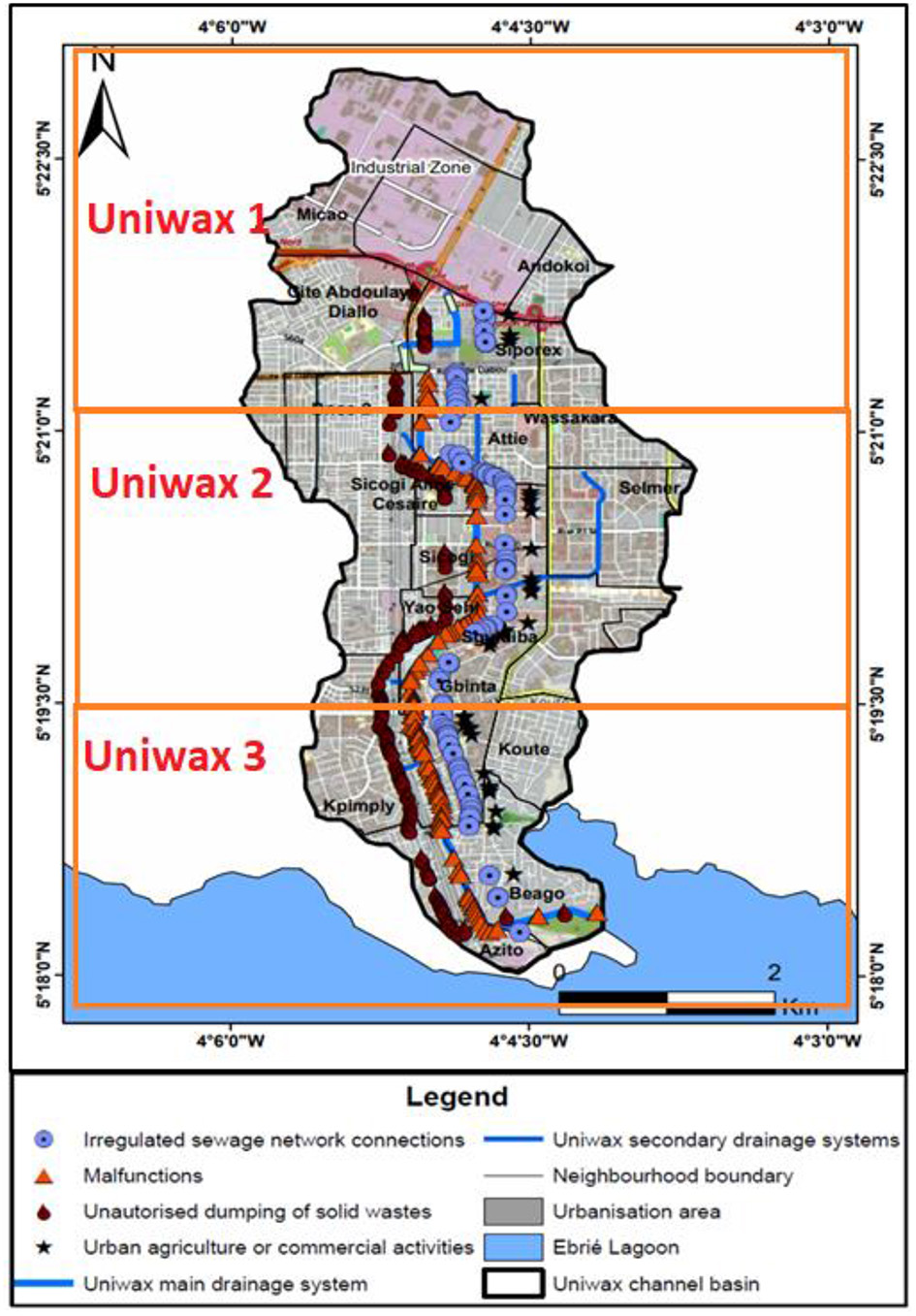 The different semi-structured interviews took place from 24 November 2020 to 18 January 2021. The institutions involved were the Ministry of Sanitation, the Water Distribution Company of Cote d'Ivoire (Sodeci), the Directorate of Urban Waste and Drainage (DAUD), the National Office of Sanitation and Drainage (ONAD), the Projet d'Amenagement de la Baie de Cocody (PABC) the Management Unit of the Guru Watershed Development and Integrated Management Programme (UGP), the Priority Works Programme (C2D), the National Office of Technical Studies and Development (BNETD), the sanitation department of the Ministry of Construction and Urban Planning (MCU), the technical services of the District of Abidjan, and the municipality of Yopougon. These interviews were carried out in order to know and understand the global functioning of the sanitation systems in general and in particular, the basic collector of the city of Abidjan as well as the sewage networks of Yopougon and the Uniwax canal. They also helped in the identification of problems related to the functioning and the main role played by each actor. Besides, they assisted in the acquisition of a cartographic database of the various wastewater and stormwater networks in the city of Abidjan, in particular the Yopougon municipality.