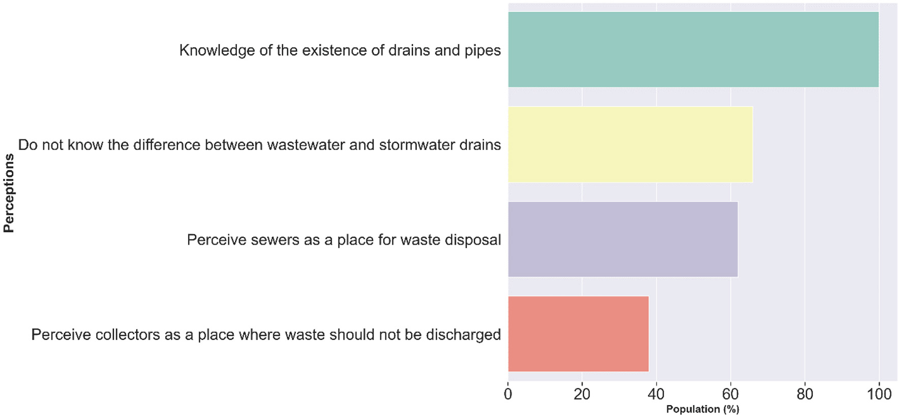 Descriptive and inferential analytical methods were used to analyze the household survey data with SPHINX software (Ver.5.1) at a statistical significance of 5% error (0.05), i.e., at a 95% confidence level. Descriptive statistics was used to analyze the socio-economic profile, the perceptions of local residents on the operation of the sewers and their liquid and solid waste management methods in relation with the networks. The internal validity of the Likert scale results was tested with Cronbach's alpha reliability (α = 0.69). This suggests that the data collection instrument is 69% reliable and will produce the same results if the study was repeated. Percentages, frequencies and means were determined by univariate analysis to understand the behavior of the parameters studied.
