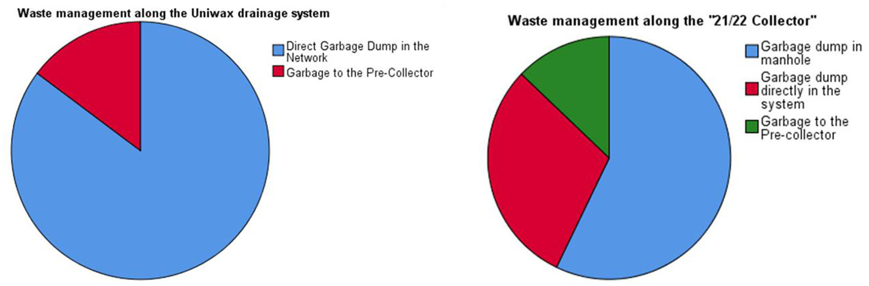 In order to describe the sanitary situation of the dysfunctional areas along the systems and to assess the behavior of household waste during rainfall and flooding, household waste was selected as the most relevant environmental parameter. The volume of solid wastes as well as its distance to the nearest drainage system was measured. After the household waste surveys, the investigations focused on other parameters such as uncontrolled connections of wastewater networks, urban agriculture, commercial activities on both sides of the networks and the behavior of the residents toward the management of the systems. The last parameter measured was the structural or anthropogenic dysfunction of the drainage system. It was examined in order to determine the presence of domestic waste and to assess its capacity to evacuate wastewater and rainwater. The measurement of environmental parameters was recorded on a pre-established data sheet, which was designed based on information obtained from previous field visits. A GPS receiver was used to take the coordinates of the points concerned and a 100 m metric tape was used either for the estimation of the volume of garbage or for the distance of the garbage to the drainage network. The estimation of the volume was possible by determining the length, width and height of the garbage dump. For the distance of the garbage dump from the drainage system, a simple measurement from the drainage system to the garbage dump was carried out. For the smooth running of the field operations, four surveyors were trained beforehand and explored all the areas concerned in the study so as to fill the survey datasheets. The interviewers were supervised by the principal investigator of the study to ensure that standard procedures were followed.