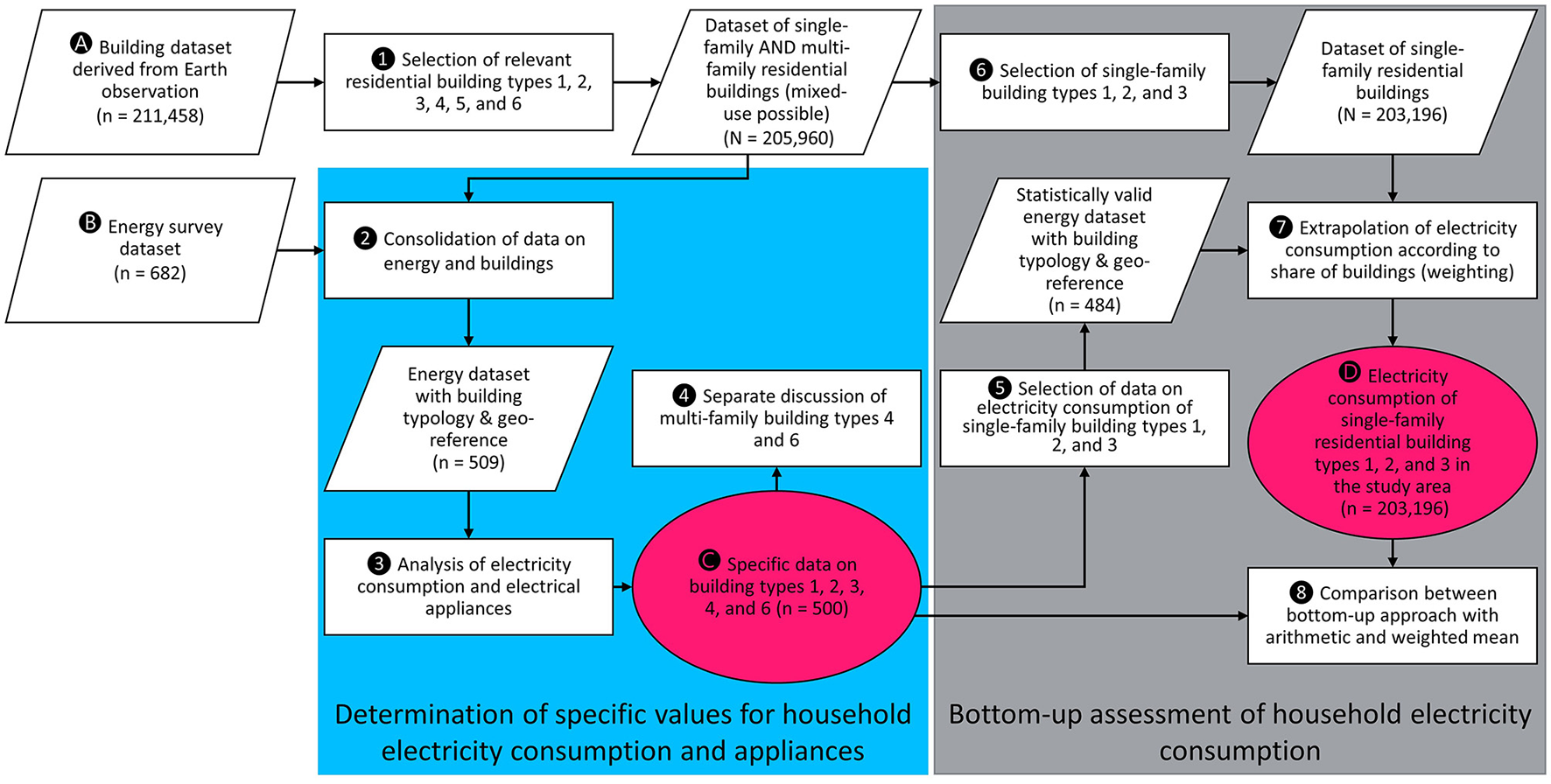 Figure 1 shows the framework for the bottom-up assessment of household electricity consumption. The starting points for this study are two datasets whose consolidation enables bottom-up analyses. Dataset (A) describes the building stock obtained through Earth observation and dataset (B) contains various specific data on individual households obtained through surveys. The consolidation is achieved by an exact assignment via GPS coordinates. The methodology can be divided into two consecutive modules. An analysis and evaluation of specific parameters based on the building typology (blue area) is followed by an extrapolation to the study area (gray area). The individual steps are elaborated in the following sections, with reference to this figure throughout the manuscript.