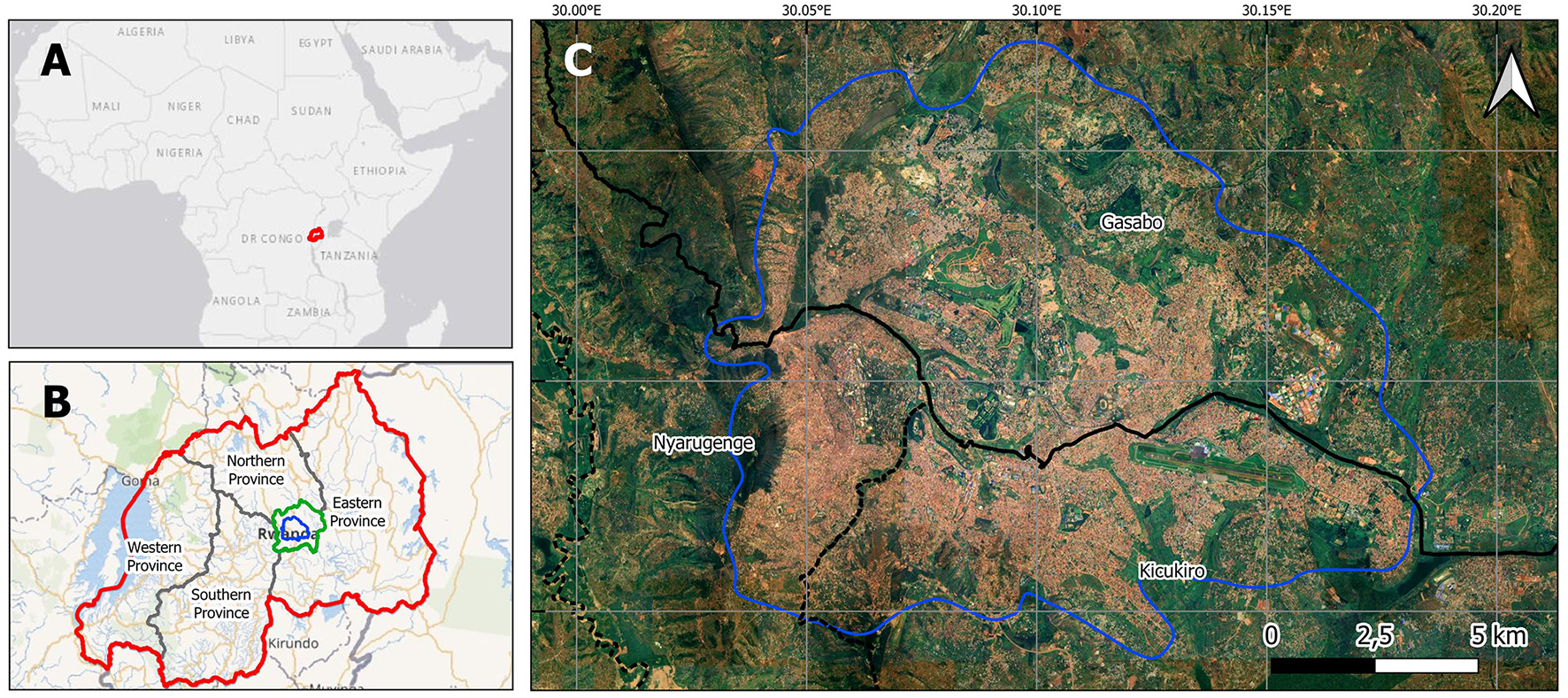 (A) Location of Rwanda in Africa (red), (B) Location of Kigali (green) and other provinces (gray) in Rwanda, study area (blue), (C) Subset of a satellite image of Kigali, its three districts (black), and study area (Pléiades satellite image of 9th August 2015 used in Bachofer et al., 2019).