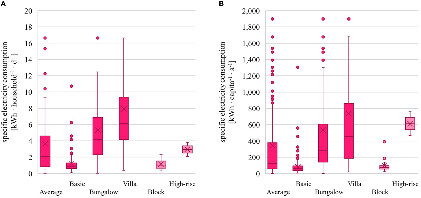 Both values of Pearson's coefficients of skewness are slightly positive which indicates a positively skewed distribution (Figure 4). Most households and consequently residential buildings have a low electricity consumption and a few have a very high consumption. When the histogram in Figure 4 is thought of as a distribution curve, the tail is longer on the right side. To obtain a more detailed picture, especially in the case of higher electricity consumption, subdividing the sample seemed reasonable (Process 3 and Outcome C Figure 1). Regarding the specific electricity consumption per household per day, the arithmetic mean was 3.66 kWh and the median was 2.08 kWh (Figure 5). Disaggregating the samples based on building types, an increasing arithmetic mean and median from Basic via Bungalow to Villa emerges. Due to the lack of validity, statistics of Block and High-rise buildings are displayed in a faded magenta color (Process 4 Figure 1). The building type Villa had an average specific electricity consumption of 7.91 kWh per household per day, which was 7 times the one of Basic (1.16) and 1.5 times the one of Bungalow (5.32). With a median value of 4.16 kWh per household per day, the building type Bungalow has a more than 4 times higher consumption than Basic (0.83 kWh per household per day). For Villas (6.12 kWh per household per day) the value is even 6 times higher.