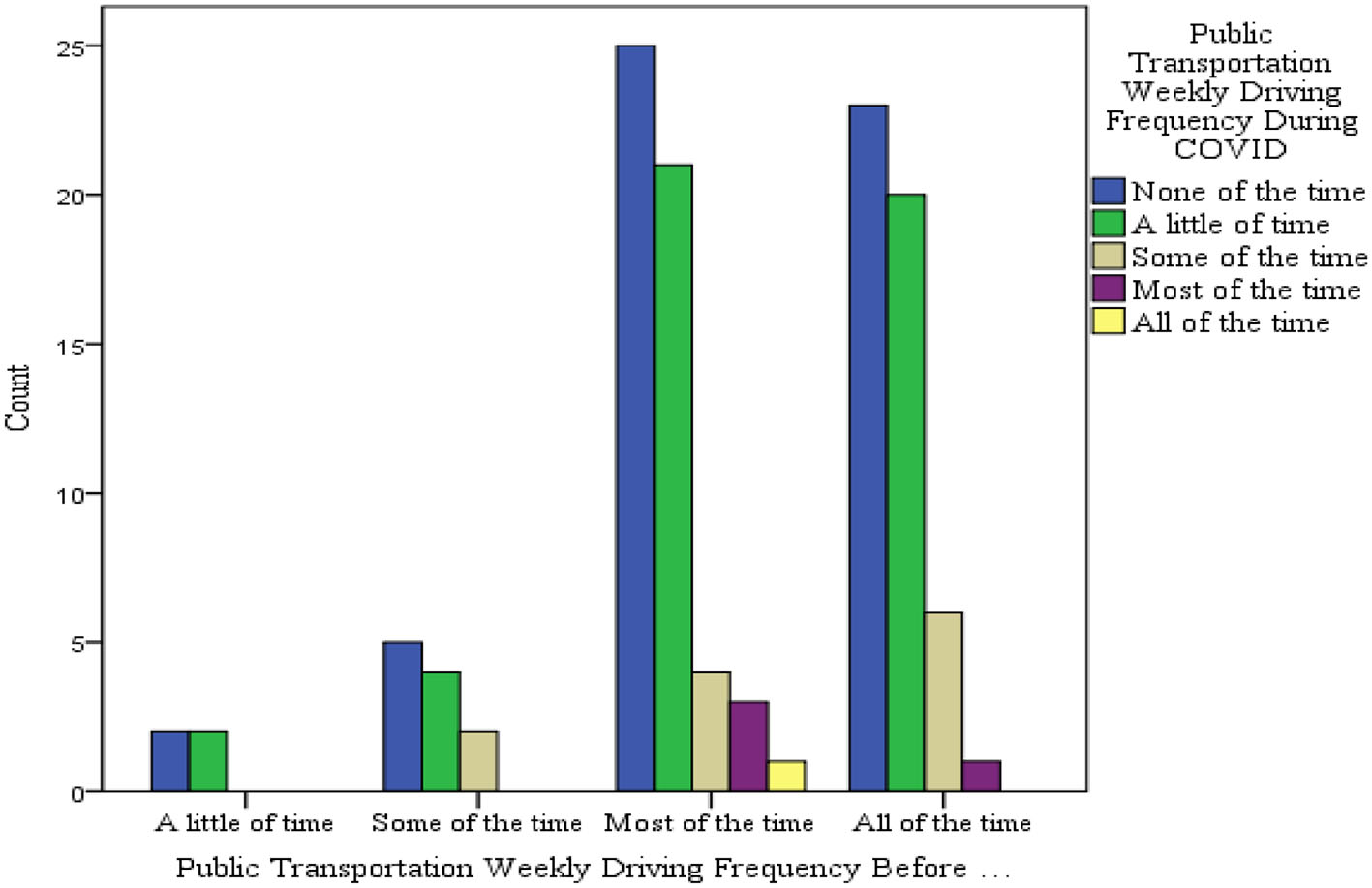 Finally, the construct “protective measures” was quantified and measured using the frequency of scores given by participants' responses to the selected indicators. These observed indicators are “the likelihood to continue the operation or driving of public transit modes, the likelihood to reduce public transit operation or driving”, and “avoid operation or driving of public transit modes” during the pandemic compared to the pre-COVID scenario. Out of these protective measures, the most frequently selected one is considered to be the most significant impact of pandemic-related aspects on public transit mode driving and customer handling behavior changes.